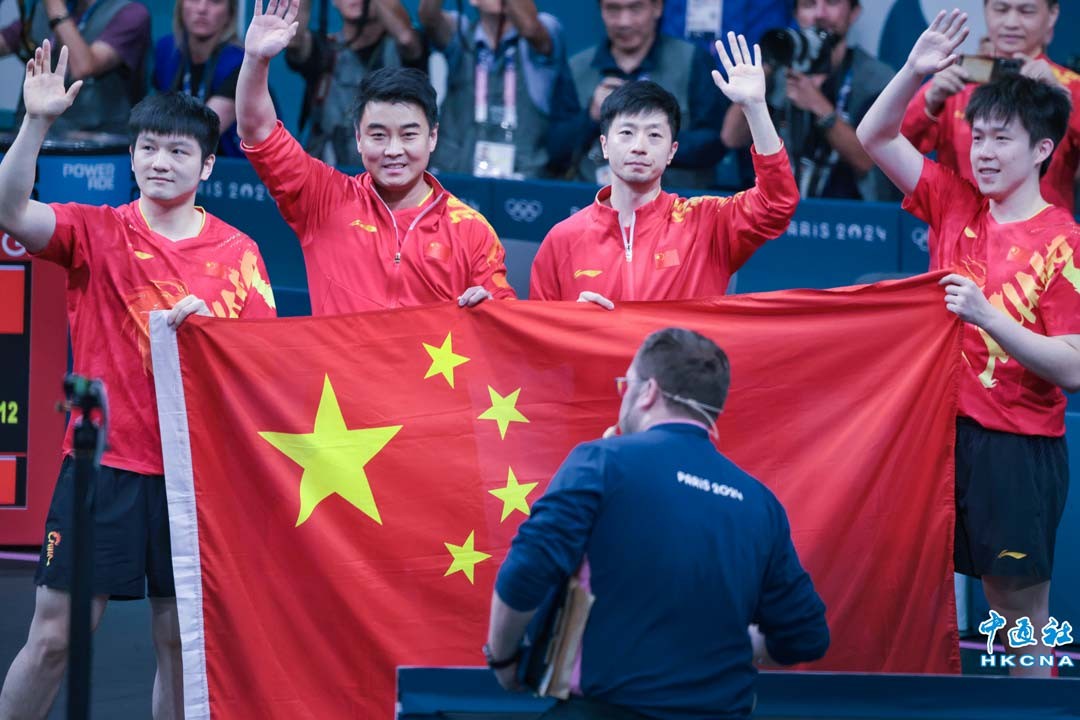 當地時間8月9日,在巴黎奧運會乒乓球男團決賽中,由馬龍、樊振東、王楚欽、梁靖崑 (P卡:替補隊員)組成的國乒男隊戰勝瑞典隊,實現奧運五連冠。(香港中通社記者 謝光磊攝)