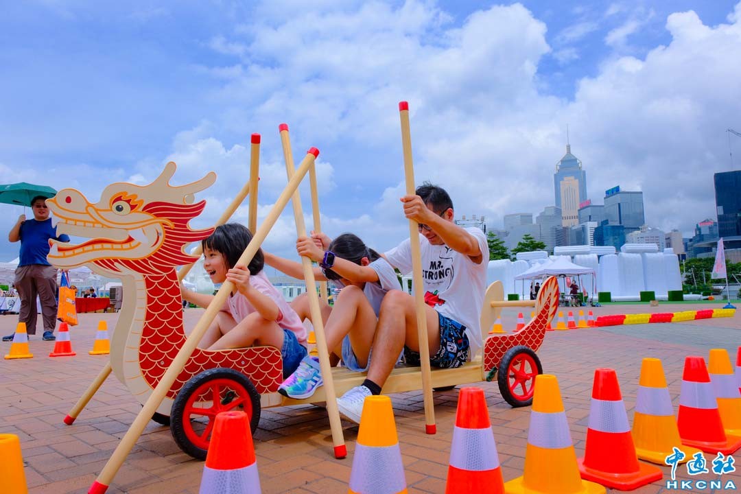 香港文化節8月10日起一連兩日於中環海濱活動空間舉辦“非物質文化遺產市集2024”。 “非物質文化遺產市集2024”以“創新蛻變:回味往昔. 躍現眼前”為主題,透過各類型活動讓市民瞭解多年以來香港非物質文化遺產的傳承與蛻變。 一系列慶典習俗、表演藝術、傳統工藝,以至生活日常中一些早已列入香港非物質文化遺產清單的獨有文化,透過互動的文化體驗遊戲攤位、工作坊,以及精彩表演與競技運動,深入淺出的為市民一一介紹。圖為市民體驗陸地龍舟。(香港中通社記者 許其皓攝)