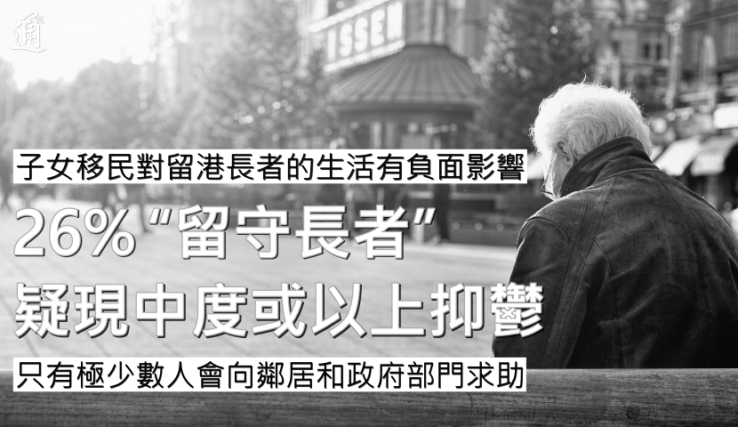 香港新聞網8月13日電 (記者 黃璇)近年,年屆60歲或以上有子女移民海外的香港銀齡一族人數逐漸增加。有商會問卷調查發現逾兩成有子女移民的“留守長者”,疑出現中度或更嚴重的抑鬱症狀,惟僅極少數人會向鄰居或政府部門求助,建議當局增撥社工資源及改善醫療服務。 經緯青年商會今年6至7月以面對面形式訪問112名60至96歲的留守長者,46%受訪者子女已全部移民。調查結果顯示27%受訪者稱與子女關係一般至不佳,21%與海外子女接觸少於每月一次,有26%長者疑似出現中度或更嚴重的抑鬱症狀。