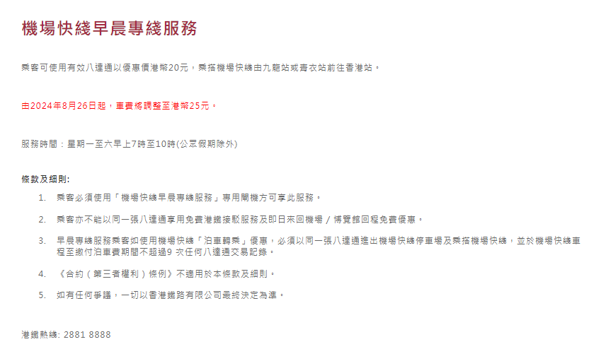 現時逢星期一至六早上7時至10時(公眾假期除外),乘客可使用有效八達通以優惠價20港元,乘搭機場快綫由九龍站或青衣站前往香港站。  (完)