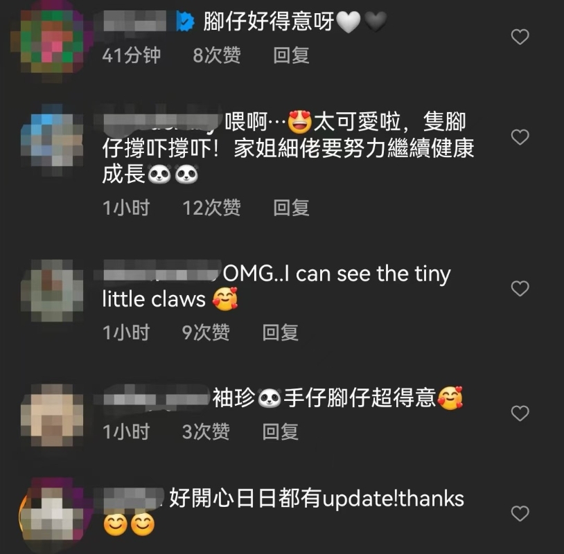 其中,大熊貓姐姐以粉嘟嘟的小肚腩,一度吸引了網友們的注意力。海洋公園放出的視頻中,大熊貓寶寶的小肚腩隨著呼吸輕微起伏,小腳丫也在一動一動的,引得網友大讚“可愛”,有網友表示,期待大熊貓寶寶十日後長出“黑眼圈”。(完)
