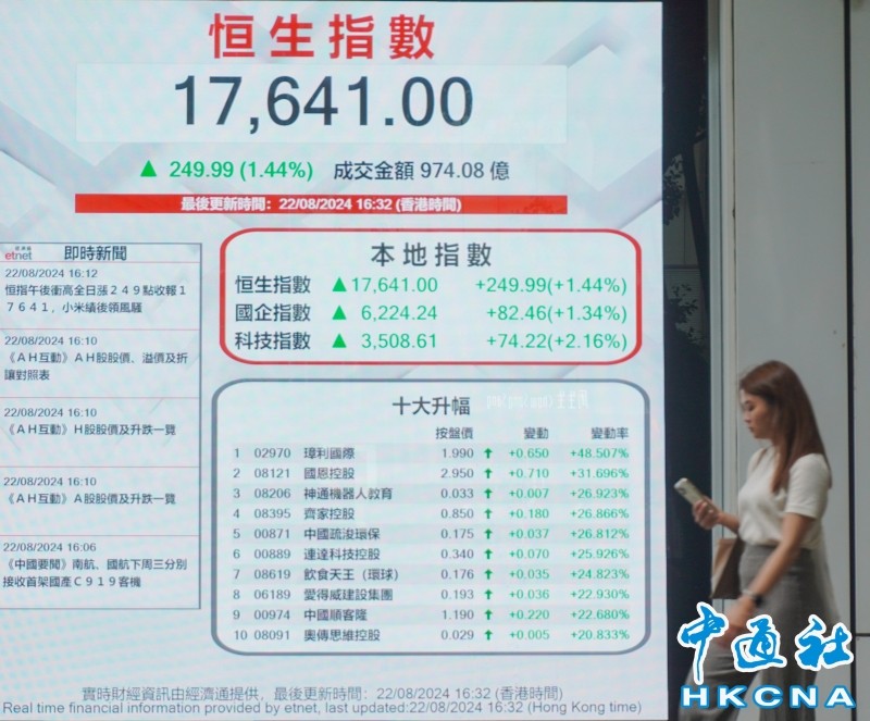 香港中通社8月22日電(記者 譚暢)港股連跌兩日後,恒指22日彈逾200點,收市報17641點,升249點或1.4%,重上50天線(約17552點)。大市全日成交約974億港元。