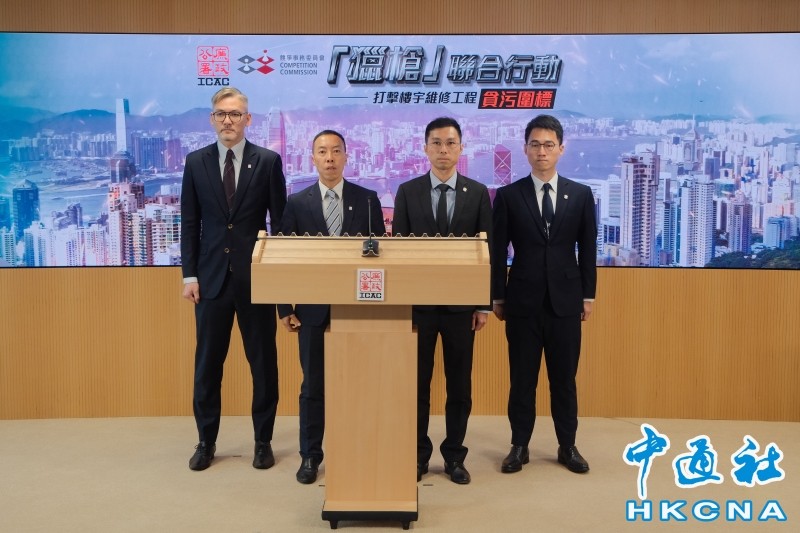 香港中通社8月26日電(記者 張明臻)香港廉政公署26日公佈,與競爭事務委員會一連兩日展開名為“獵槍”的聯合行動,打擊樓宇維修工程貪污和圍標行為。行動共拘捕5人,項目涉及兩個港島屋苑工程,涉1.4億港元維修合約。