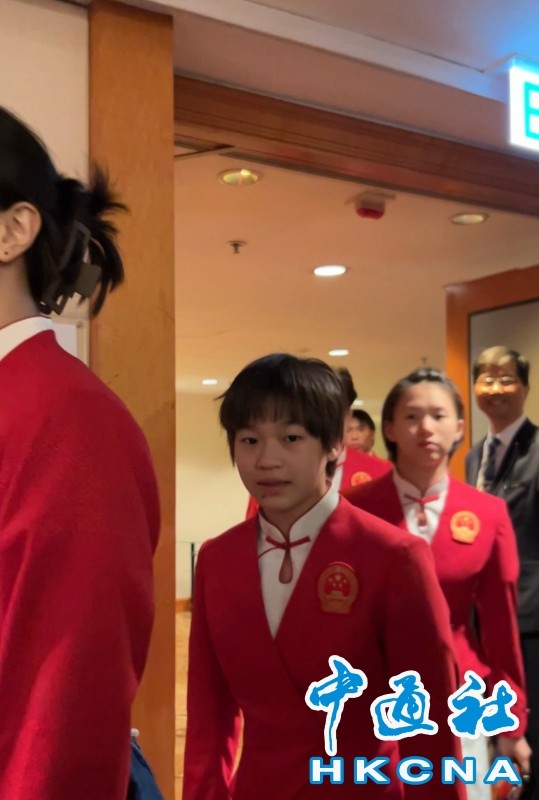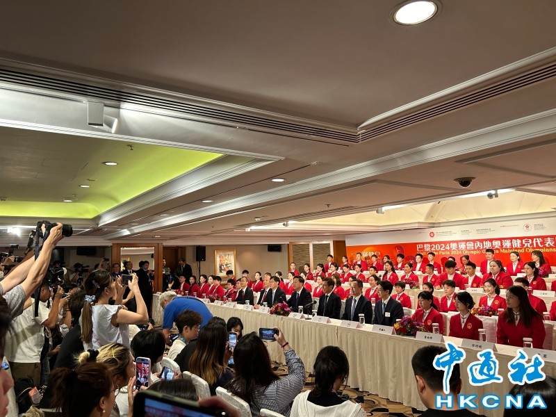 香港中通社8月29日電(香港中通社記者徐嘉儀)穿著一身“中國紅”西裝,65位參加巴黎奧運的中國內地運動員29日在香港尖沙咀一家酒店亮相,現場閃光燈、快門聲此起彼落,記者頻頻揮手希望得到運動員注意,搶到最佳鏡頭。