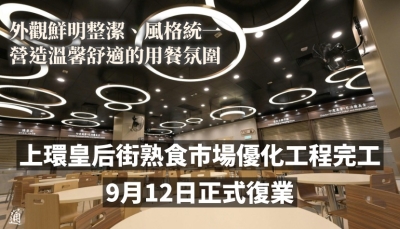 香港新聞網9月10日電 香港特區政府食物環境衞生署發言人10日表示,皇后街熟食市場的優化攤檔工程已經完成,將於12日(星期四)正式全面復業。
