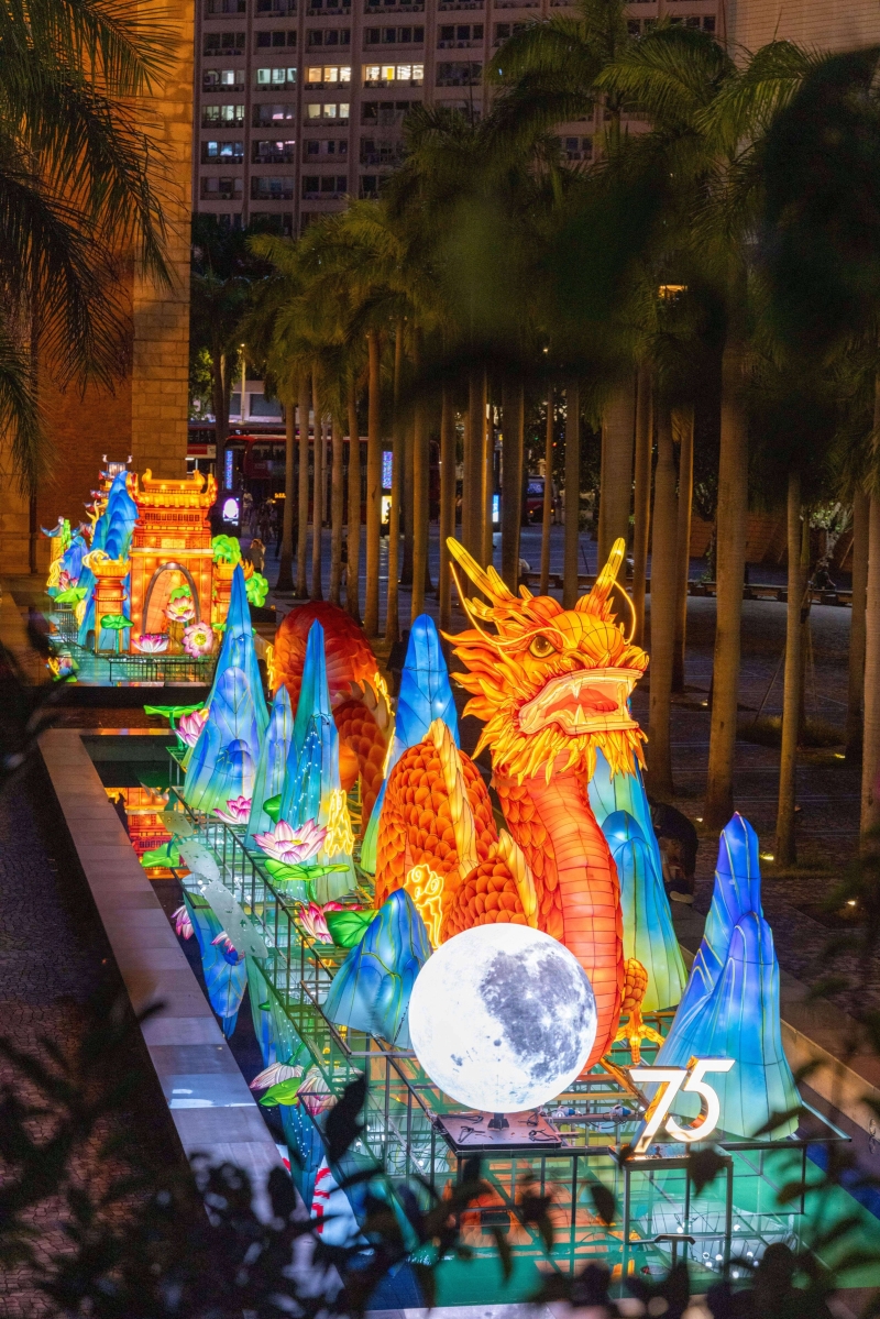 圖源:政府新聞處。 綵燈亮燈時間為每日下午6時30分至晚上11時,中秋節17日當晚則延長至凌晨12時。 《月上龍宮》由本地多媒體藝術家蘇暐朝創作,以龍為主體設計概念,結合多媒體藝術與四川省自貢市的傳統花燈紮作工藝,展示中國人熱愛中秋傳統,並擁有遠大理想和抱負,追逐天上的明月,實現載人登月的願景。