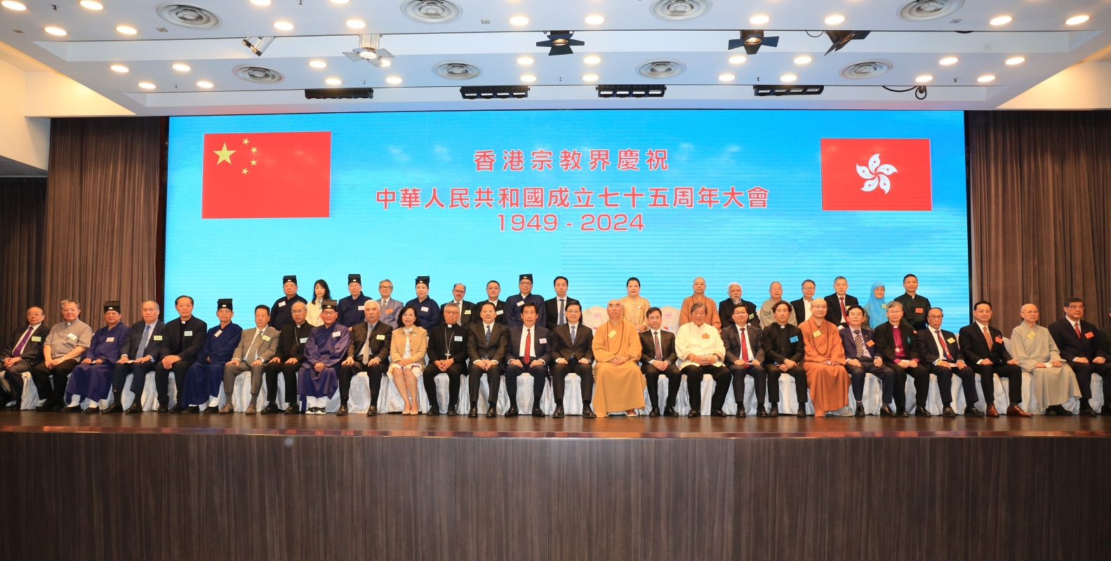 香港宗教界舉辦慶祝中華人民共和國成立75周年大會香港新聞網9月12日電 10日下午5時,香港宗教界假座尖沙咀龍堡國際一樓胡應湘宴會廳,隆重舉行“香港宗教界慶祝中華人民共和國成立75周年大會”。香港特別行政區行政長官李家超、中央駐港聯絡辦公室副主任尹宗華,以及國家宗教事務局宗教綜合局局長黃志輝出席主禮,聯同特區政府民政及青年事務局局長麥美娟、中聯辦協調部副部長陳澤濤、各宗教領袖、代表,共同向國家送上真誠祝福。 大會輪值主席、香港道教聯合會副主席陳國超道長首先致歡迎辭,祝賀祖國國運昌盛,香港紫荊明豔,獅子山精神永駐香江。他表示,宗教是人類文明的重要基石,是深入心性的陶冶,是生活美感的體悟,是對社會的關懷與奉獻,甚至是對人類和平的追求;六宗教領袖座談會成立至今四十餘載,一直竭力求同存異,互相尊重,發揮宗教推動力,共同服務香港社會和政府施政。