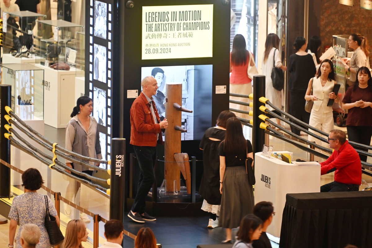香港新聞網9月13日電 (記者 洪少葵)9月13日下午,香港媒體記者在太古廣場率先參觀“武動傳奇:王者風範”展品。現場欣賞到李小龍的電影道具/訓練設備和個人文物交織在一起的獨特敘事。展品共同體現了超越界限並激勵幾代人的創新和藝術精神。即將拍賣部分展品亮點包括李小龍用來訓練的木人樁,他的電影《精武門》和《龍爭虎鬥》等經典電影中使用的標誌性道具,以及反映他對截拳道哲學的深刻奉獻的個人物品。“武動傳奇:王者風範”展於9月14日至27日在金鐘太古廣場舉行,供公眾參觀欣賞。 朱利安拍賣行(Julien’s Auctions)將於9月28日呈獻香港首場拍賣——“武動傳奇:王者風範”,拍賣將於港島香格里拉酒店現場舉行,並同步在網上平台juliensauctions.com進行。拍賣匯集來自音樂、娛樂及體育界眾多王者級人物的珍藏,當中以武術傳奇李小龍的獨家珍藏最為矚目。