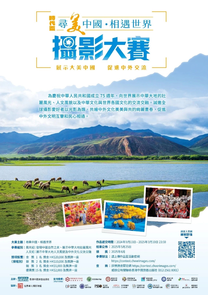香港新聞網9月13日電 為慶祝中華人民共和國成立75周年,向世界展示中華大地的壯麗風光、人文風貌以及中華文化與世界各國文化的交流交融,香港中國旅遊出版社主辦、世界華人攝影聯盟協辦攝影大賽,邀全球攝影愛好者共繪中外文化美美與共的絢麗畫卷,促進中外文明互鑒和民心相通。 征稿時間由2024年9月13日—2025年3月10日(香港時間 23:59),評審時間為2025年4月25日,2025年5月25日公佈結果,2025年6月頒獎。