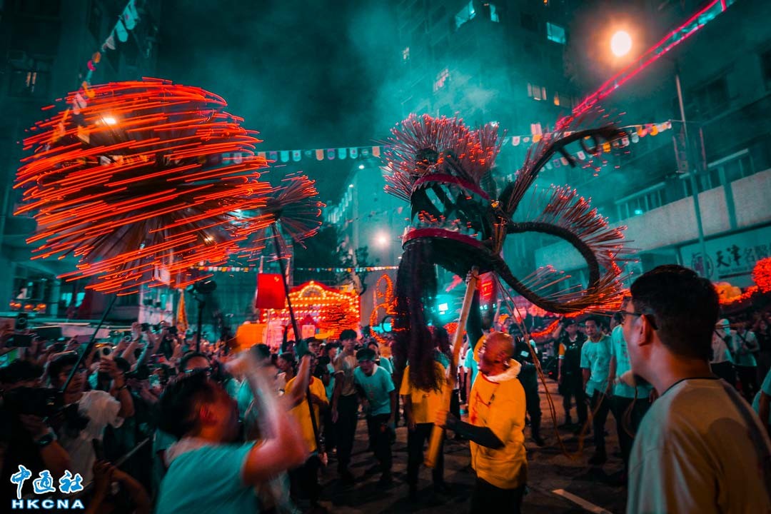 每年中秋節,大坑街頭都因舞火龍而熱鬧非凡。這項傳統可追溯至19世紀,當時居民以插滿線香的火龍驅趕疫症,這份團結精神一直傳承至今。(香港中通社記者 許其皓攝)