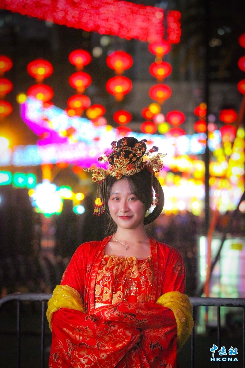 9月16日,中秋節迎月夜,市民穿著漢服在維園欣賞五光十色,流光四溢的綵燈。(香港中通社記者洪少葵攝)