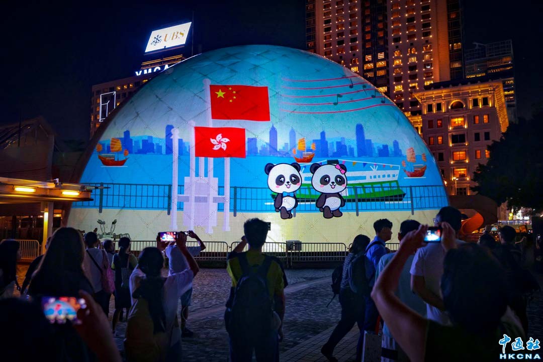 9月16日晚,位於尖沙咀的香港太空館外牆上演動畫投影“喜迎熊貓香江行光雕匯演慶團圓”,在蛋形外牆投影“四川家園”、“遊歷香港”等主題的熊貓文創動畫,演繹兩隻大熊貓從四川抵達香港、再搭乘火箭登陸月球品嘗月餅等內容,為中秋節增添氣氛。(香港中通社記者 謝光磊攝)