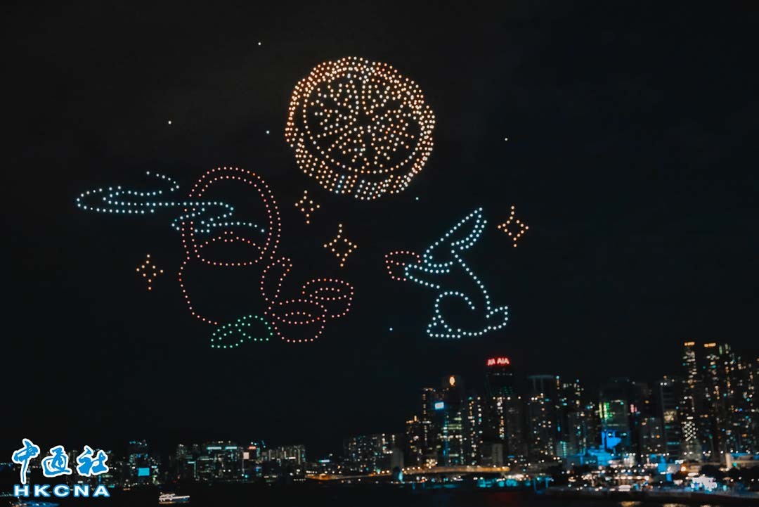 9月17日,香港旅遊發展局在灣仔海濱場地對出海面上演以中秋節慶為主題的無人機表演。1000架無人機在維港上空呈現多幅具有中秋意境的動態畫面,包括傳統造型兔子燈籠、月餅、火龍等,更有熊貓和玉兔一同賞月的圖案,吸引大批香港市民前來觀賞。(香港中通社記者 謝光磊攝)