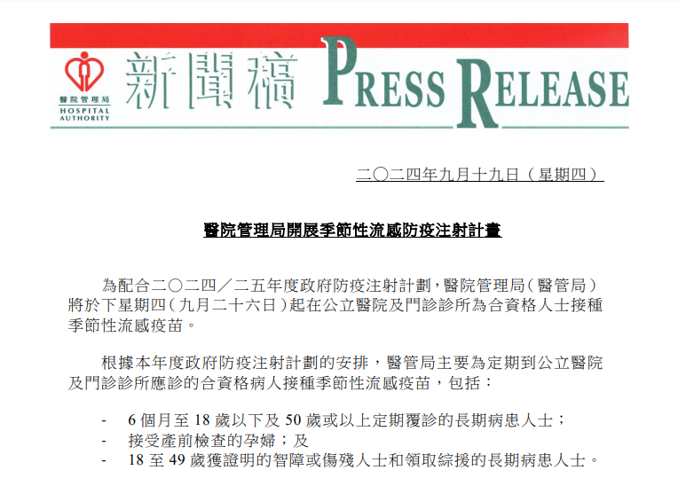香港醫管局26日起為合資格人士接種流感疫苗分享到: