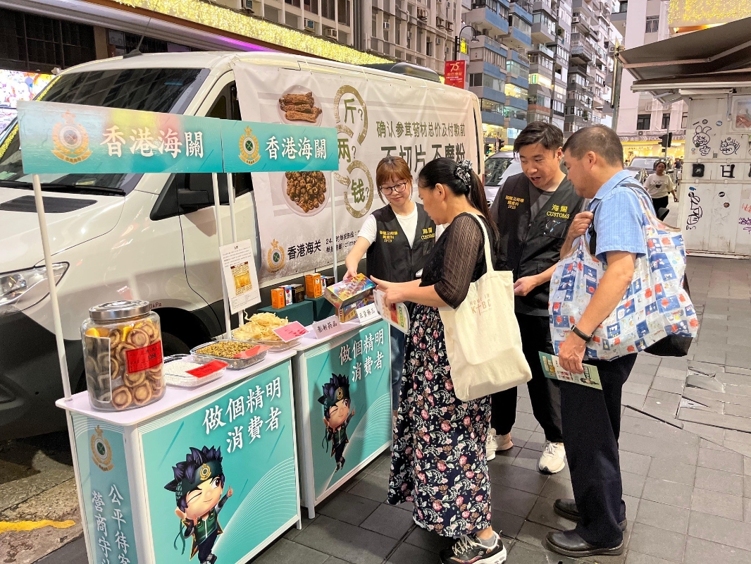 圖源:政府新聞處。 海關人員除了巡查購物熱點外,亦會到油尖旺和銅鑼灣等旅遊購物區的參茸海味、藥店及珠寶首飾等店鋪進行合規推廣的宣傳教育,提醒零售商戶和旅遊從業員遵守條例規定。 海關人員亦到陸路口岸和各區購物熱點派發單張,提醒旅客在購物前要清楚貨品的規格,多作比較,並且光顧信譽良好的商戶;付款前要確定貨品的總價格和計價單位,購物後亦要保留單據及付款紀錄,若日後需要作出舉報,可作為憑證。 海關一直十分關注有商戶以不良營商手法誤導旅客購物的情況,設有“快速行動隊”處理短期留港旅客的緊急投訴,並會即時轉介有關個案予調查人員作優先處理。