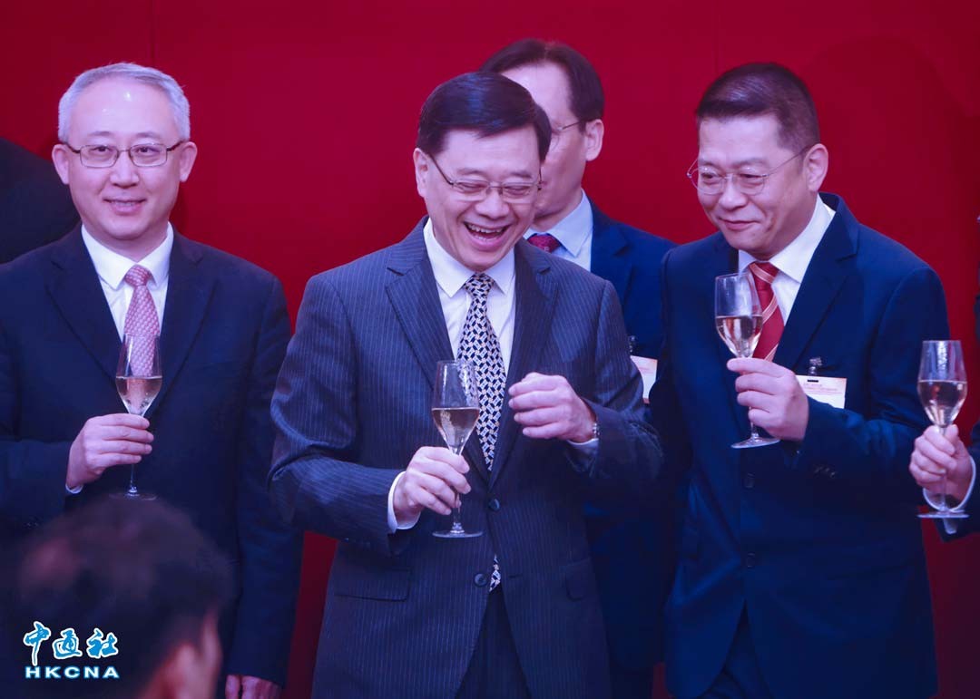 9月25日,香港工商界同胞慶祝國慶籌委會舉行“慶祝中華人民共和國成立75周年國慶酒會”。香港特別行政區行政長官李家超、中央政府駐港聯絡辦副主任尹宗華、外交部駐港特派員公署副特派員李永勝、香港特區政府政務司司長陳國基及立法會主席梁君彥等出席活動並擔任主禮嘉賓,聯同籌備委員會主席團成員、工商及社會各界友好逾500位嘉賓共賀國慶。圖為祝酒儀式。(香港中通社記者 謝光磊攝)