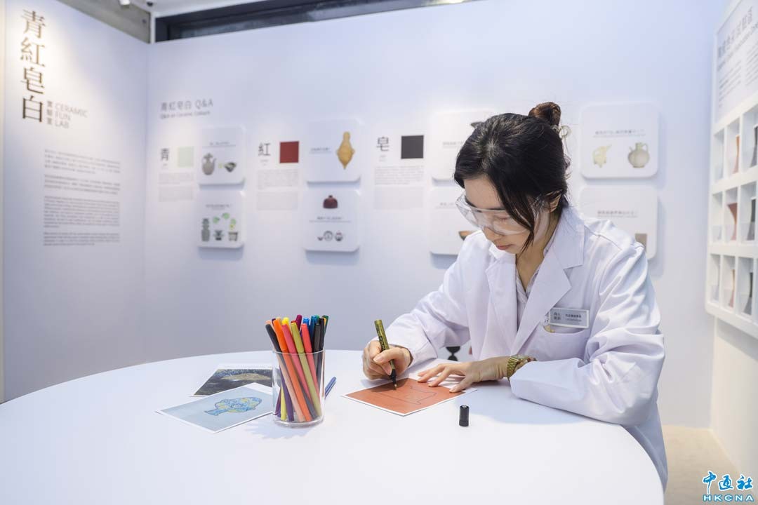 “古早策展人系列:陶人新語——穿越時空的色彩實驗”將於9月26日在香港油街實現舉辦,為弘揚中華文化系列的活動之一。是次展覽設有“青紅皂白實驗室”,工作人員化身成陶瓷實驗專員,以生動有趣的方式,讓觀眾認識陶瓷製作的竅門。觀眾亦可以在“陶瓷色彩試驗區”挑選一種陶瓷專色,自製成個人專屬的明信片帶回家中留念。(香港中通社記者 曹文毓攝)