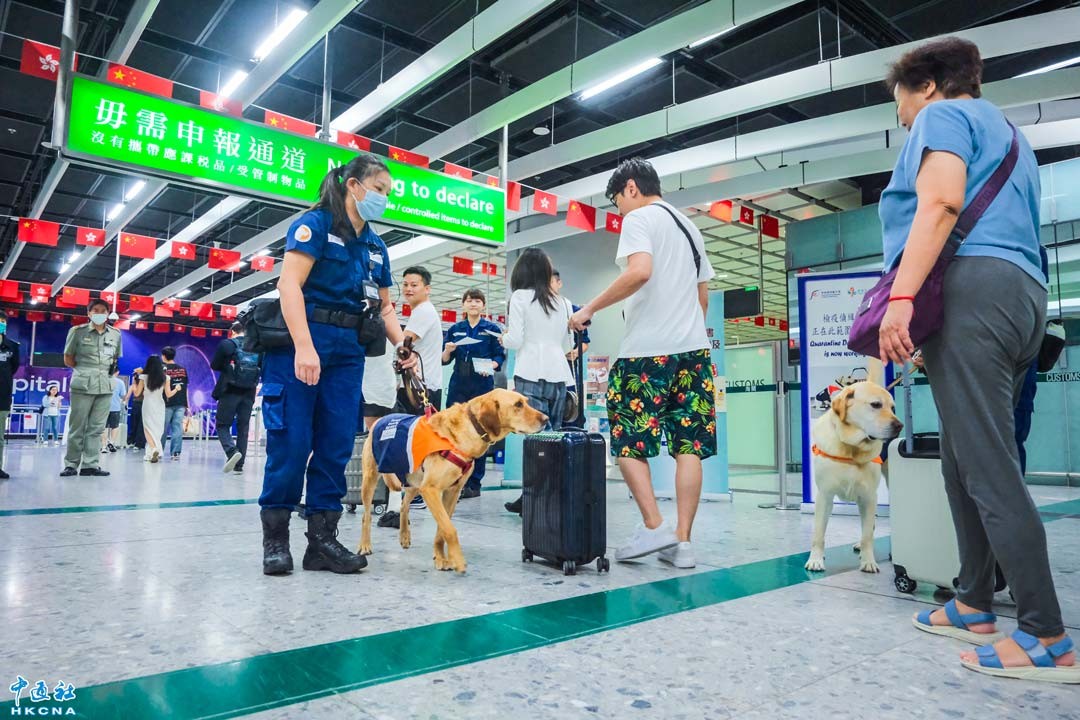 9月25日,香港海關與食物環境衞生署食物安全中心舉行聯合新聞發布會,講述打擊入境人士非法攜帶受規管食物到港聯合行動,提醒市民切勿攜帶沒有衞生證明書的肉類等產品入境,以免負上刑責。圖為新聞發布會後海關和食安中心於西九龍站入境口岸展示行動細節。(香港中通社記者 許其皓攝)