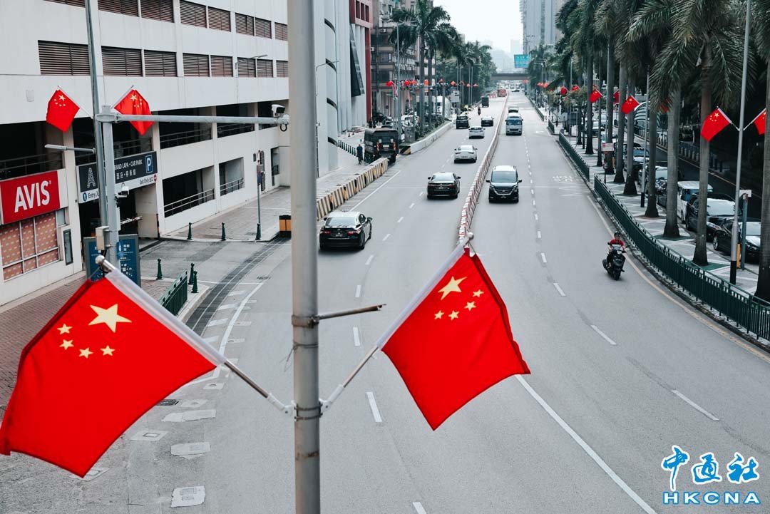 9月27日,臨近國慶節,澳門街頭掛滿了中華人民共和國國旗和慶祝國慶大型標語,營造濃厚的慶祝國慶75周年氛圍。(香港中通社記者 謝光磊攝)