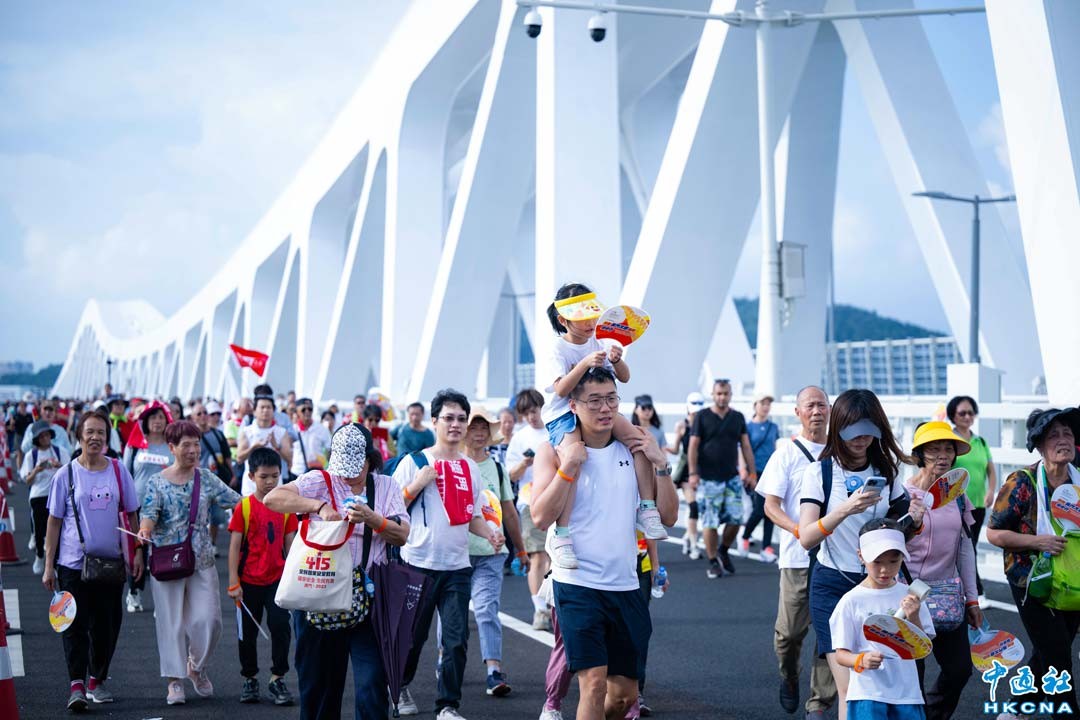 9月29日,“齊賀澳門大橋開通健步行”早上 8時起步,有 2.1萬人參與。行政長官賀一誠和多名主要官員出席起步禮。健步行分團體和個人參加者,其中率先起步的團體參加者約有 150個團體參加,當中包括兒童及長者。健步行活動全程約 6公里,預計行完全程約需 1.5小時,中途不設離場通道。香港中通社圖片