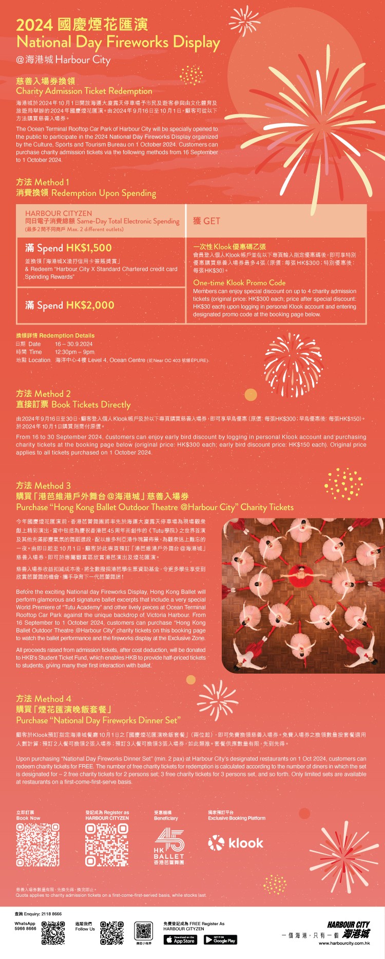 圖源:海港城。 今年海港城亦會開放海運大廈露天停車場舉辦煙花觀賞活動,預計將有近萬名市民參與,一同欣賞這香港盛事。此外,海港城更特別邀請香港芭蕾舞團(港芭)的舞者,聯同香港芭蕾舞學院的年輕學員,於國慶日晚上8時在維港景緻下呈獻戶外芭蕾舞演出,上演港芭為45周年創作的《Tutu學院》,以及《愛麗絲夢遊仙境》和港芭經典節目的精采選段。 (完) 【編輯:譚暢】