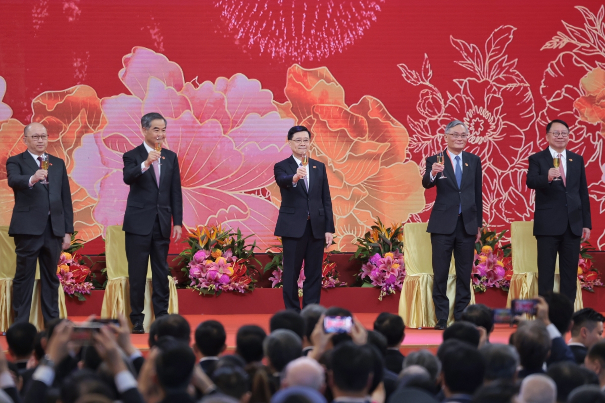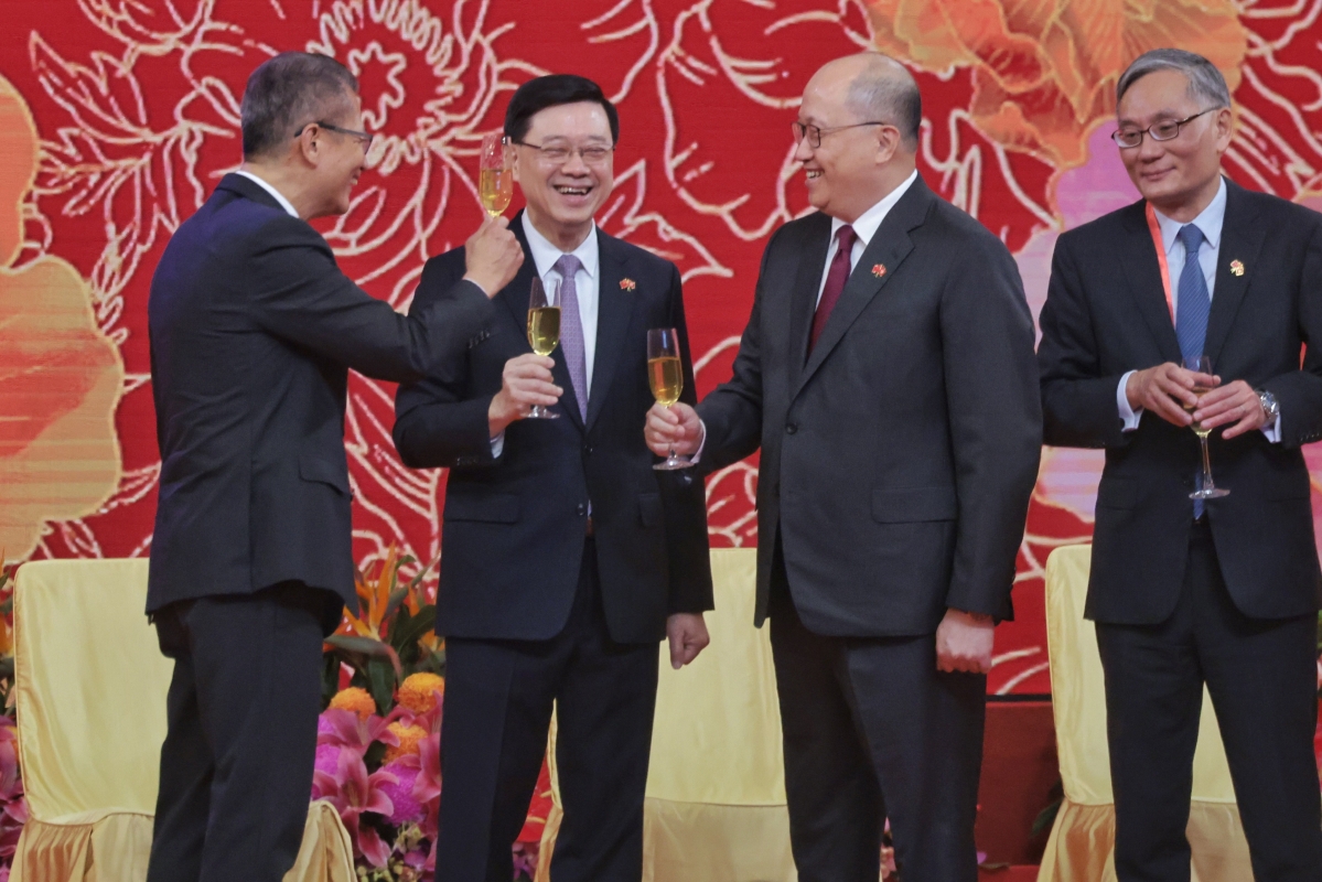 全國政協副主席梁振英(左二)、行政長官李家超(中)、中聯辦主任鄭雁雄(左)等主禮嘉賓出席國慶酒會