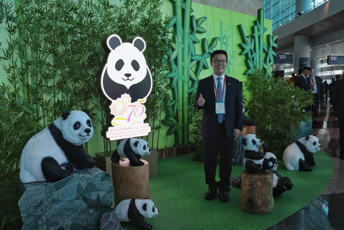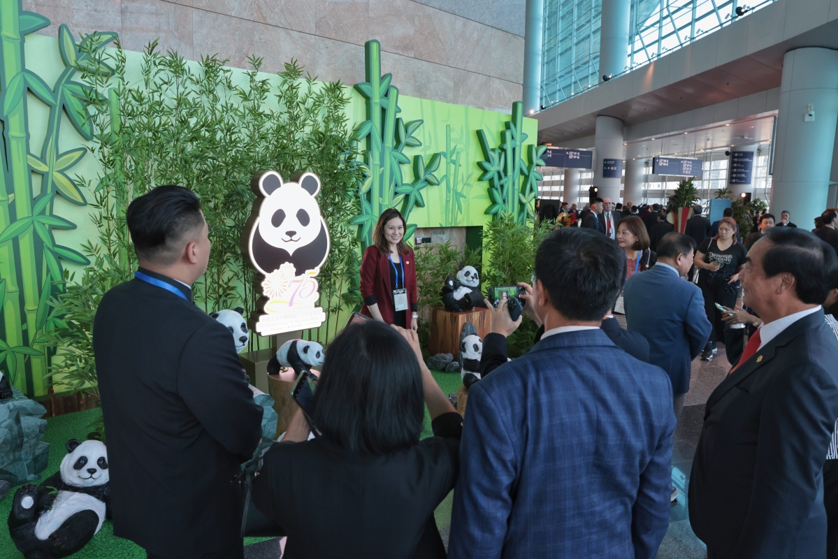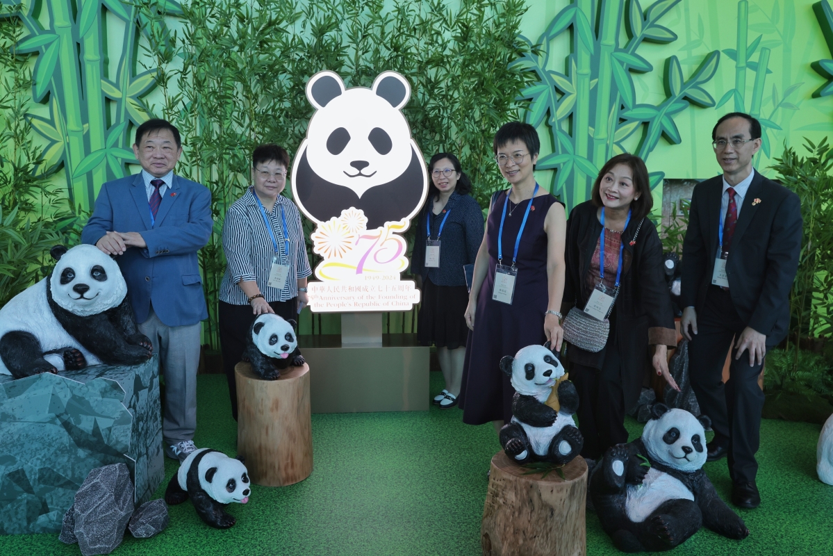 嘉賓在香港特區國慶酒會上與熊貓元素合影