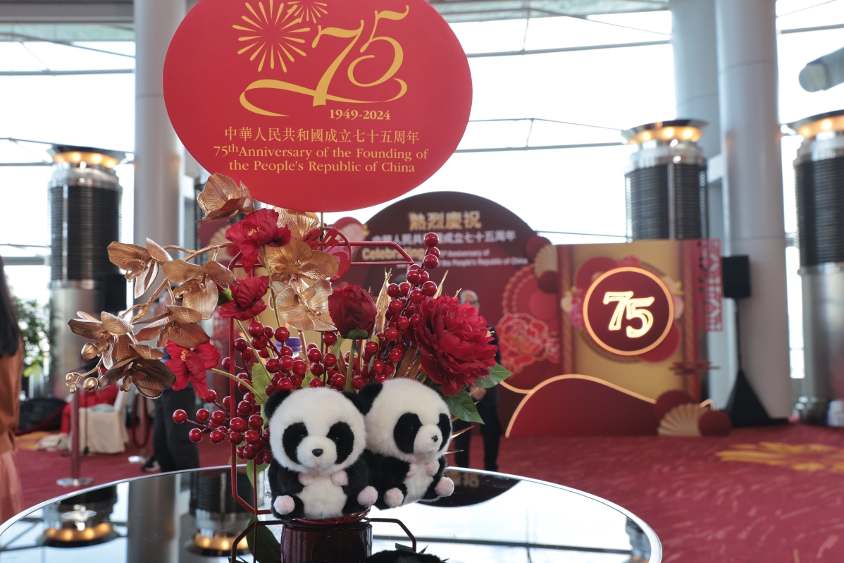 香港新聞網10月1日電(記者 謝光磊)10月1日上午,香港特區政府在會議展覽中心舉行國慶酒會,慶祝中華人民共和國成立75周年。日前,中央政府贈港大熊貓“安安”和“可可”抵達香港,本次國慶酒會會場內也布滿了各式熊貓元素裝飾,吸引許多嘉賓拍照打卡。