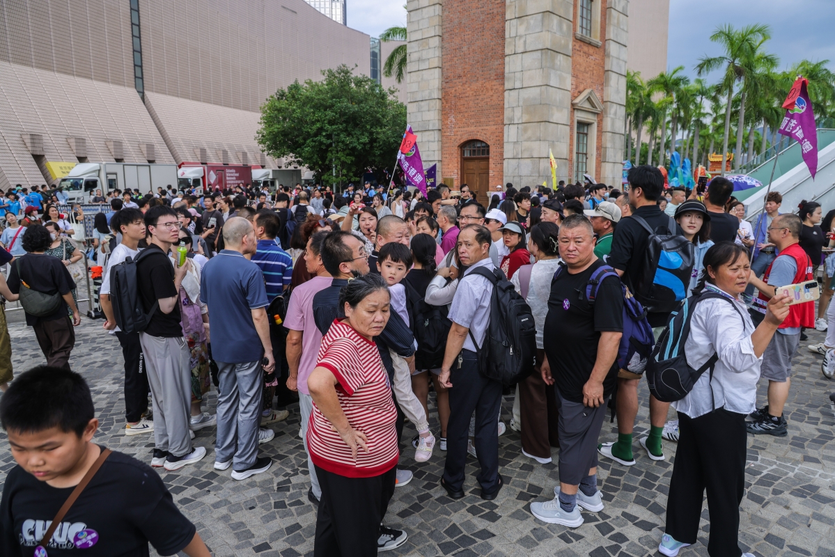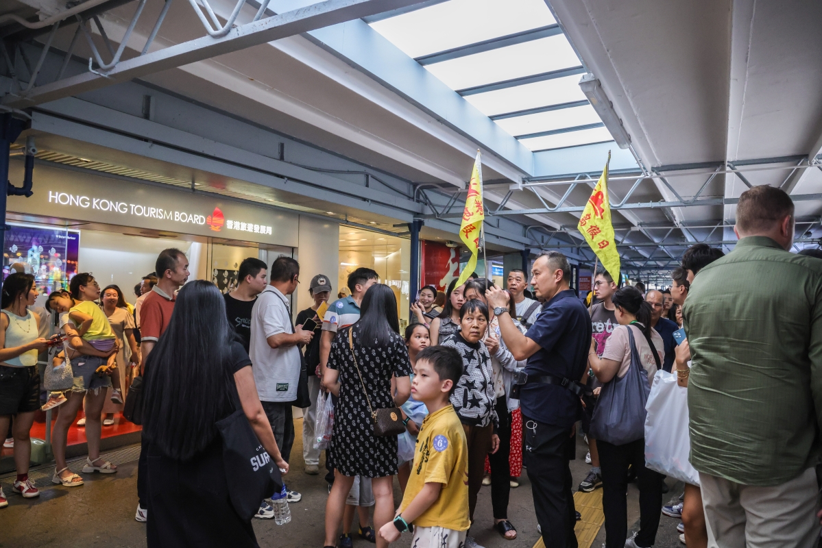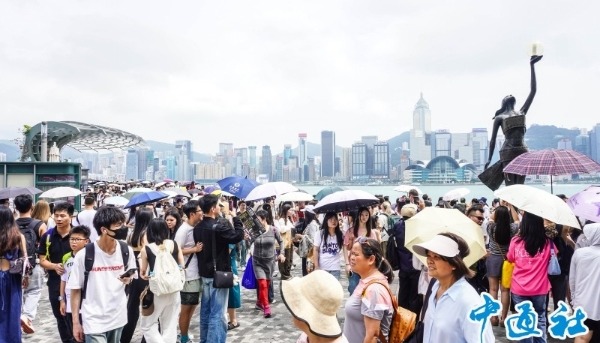 香港新聞網10月1日電(記者 曹文毓) 10月1日正值內地十一黃金周首日,不少遊客特地來到香港歡度國慶,記者在尖沙咀一帶看到眾多旅遊團抵達,星光大道幾近爆滿,文化中心廣場人流更是絡繹不絕。香港藝術館前也有排隊人龍。日前,香港旅遊業預計,期內有約115至120萬內地旅客訪港,按年增長近兩成;旅行團則有約900個以上,較去年同期升一成。
