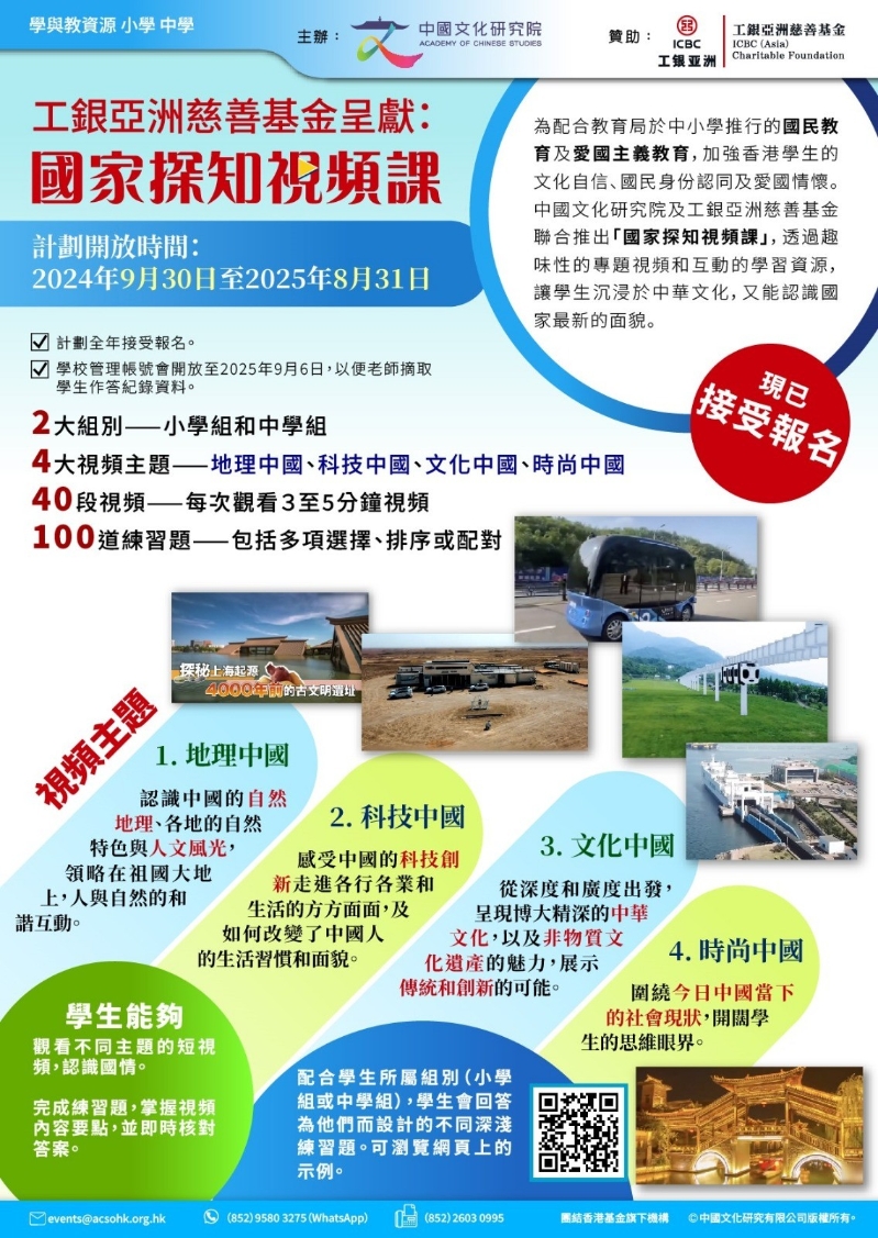 為配合教育局於香港中小學推行的國民教育及愛國主義教育,工銀亞洲慈善基金全力支持文研院,圍繞地理中國、科技中國、文化中國及時尚中國四大主題製作40段學習視頻,讓學生從多角度掌握國家最新發展面貌,開闊思維眼界,深化課堂所學。 系列 專 題 視 頻 已 由 2024 年 9 月 起 上 載 於 文 研 院 的 “溫習快線平台”(網址:https://learning.chiculture.org.hk/campaign-chinavideo2024/intro),於2024/2025 學年開放予全港中小學生登記使用,覆蓋所有香港官立、直資及津貼學校的小一至中六級學生。 “溫習快線平台”亦特設配套專題練習(包括多項選擇、排序及配對),並附有即時批改答案功能,可讓學生自行評估學習進度、培養學習主動性,以更立體的方式認識國家的地理風采、創新科技、傳統文化及社會現狀。 中國工商銀行(亞洲)董事長兼執行董事、工銀亞洲慈善基金主席劉亞干表示,青少年作為未來社會可堪大任的棟樑之才,可在國家邁向中華民族偉大復興的征程中發揮重要作用。工銀亞洲慈善基金一直致力以金融慈善力量推動青年教育工作,特別攜手文研院積極響應香港特區政府開展愛國主義教育的號召,助力學校傳承和弘揚中華文化,讓青年學子透過多元學習方式從小建立國民身份認同、培養愛國之情、砥礪強國之志,從而凝聚全民族共同為國家高質量發展貢獻力量。 中國文化研究院院長邱逸指出,坊間一直以來缺少國民教育及愛國主義的生動有趣的教育資源,文研院希望透過製作合適和具質素的『視頻課』系列,讓學生能寓趣於學,無論是自學,還是搭配學校課程;老師也能有更好的輔助教學資源,完善教學。(完) 【編輯:張明臻】