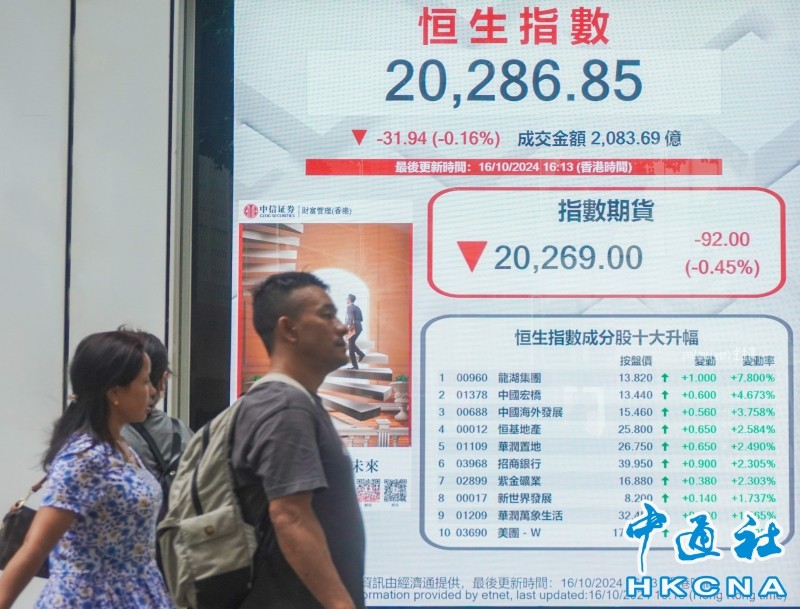 香港中通社10月16日電 (記者 徐嘉儀)香港特區行政長官李家超16日發表上任後第三份施政報告,港股受相關措施提振一度升逾兩百點。惟A股走弱,恆生指數收市報20286點,跌31點。大市成交額為2083億港元。
