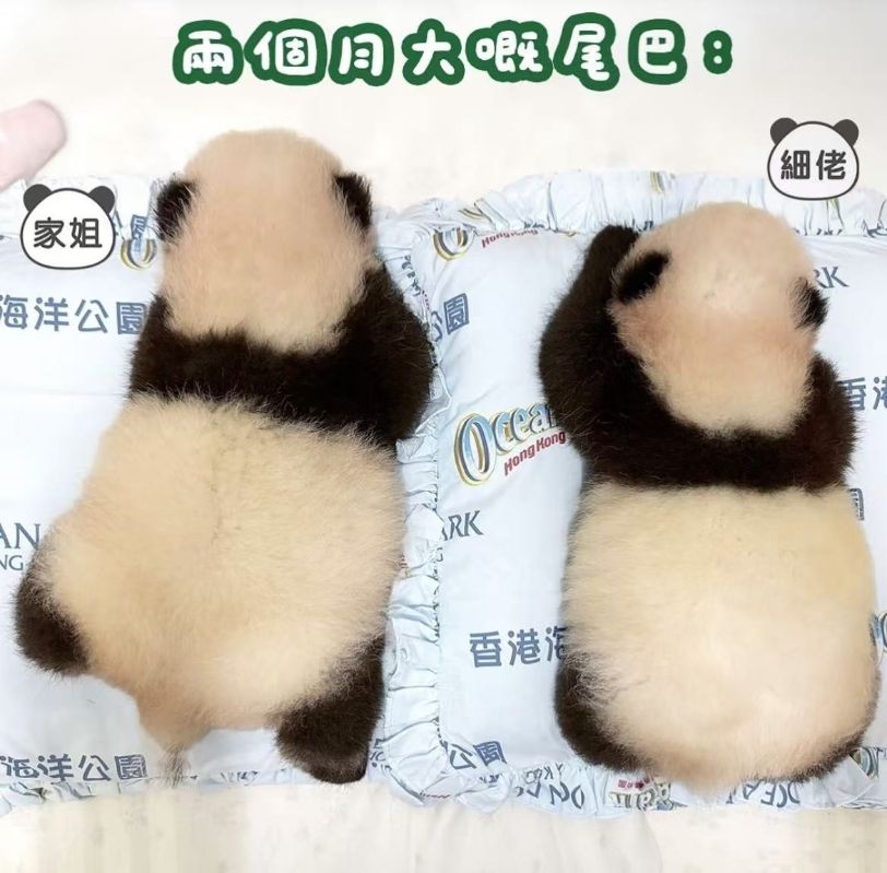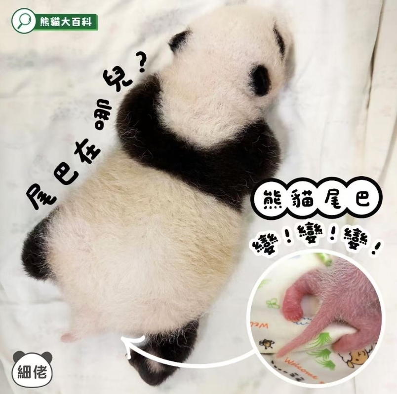 另一張照片則是嬰兒時期的大熊貓,尾巴清晰可見。海洋公園表示, 大熊貓其實有尾巴,不過長大後會被毛髮遮住,因此不太明顯。貼文解釋,初生大熊貓的尾巴和身長比例約為一比四,但在成長過程中,尾巴的增幅不及身體增幅大,因此成年後,大熊貓的尾巴和身長比例變成一比十,較難看見。(完)