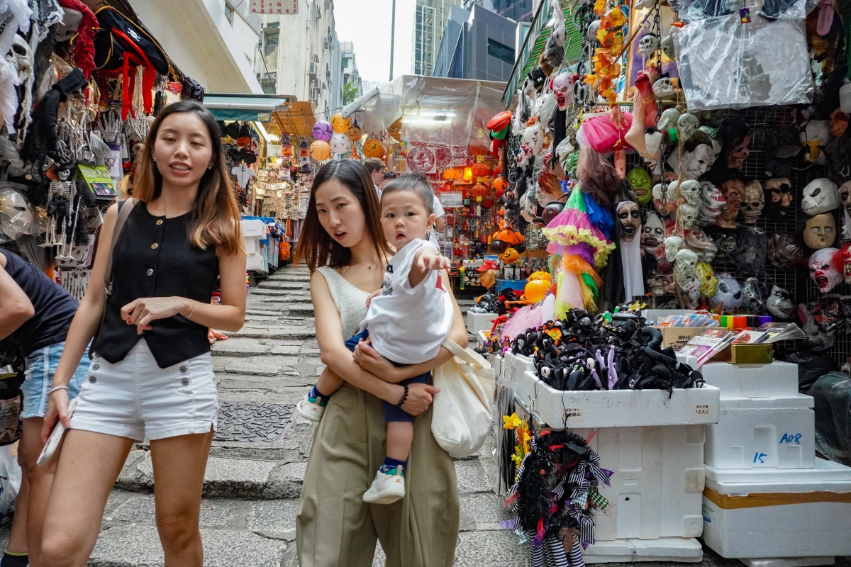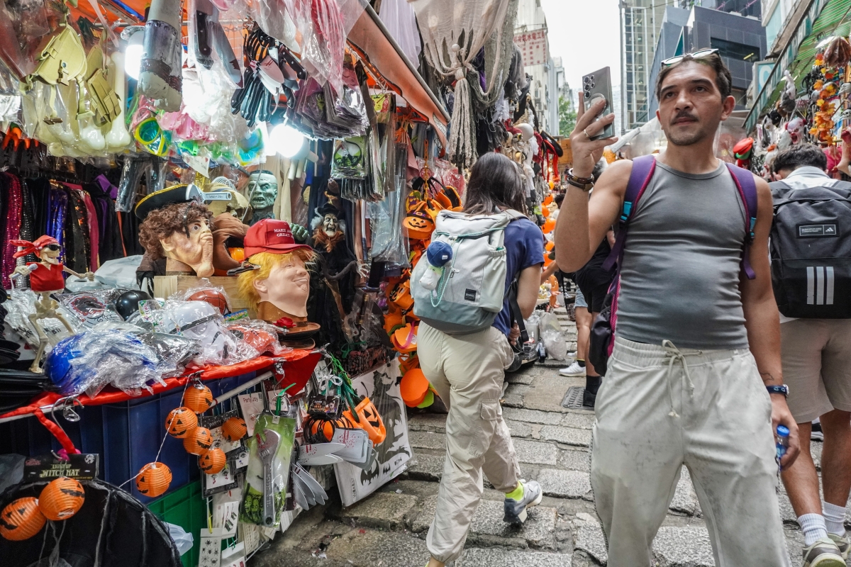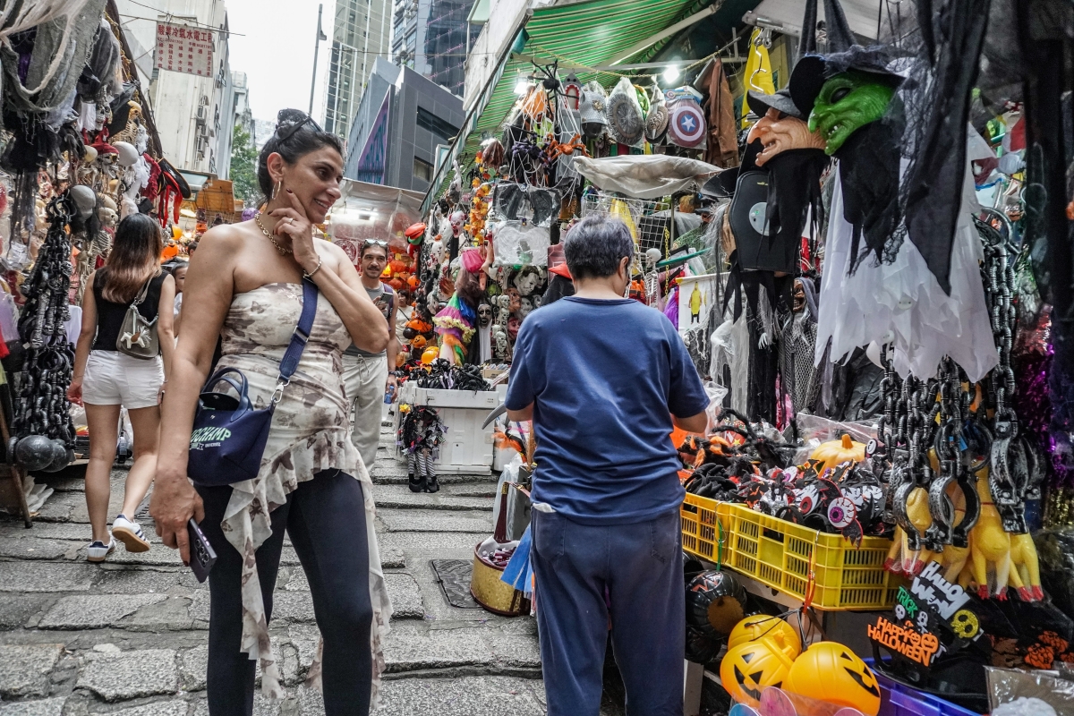 香港新聞網10月21日電(記者曹文毓)萬聖節將至,香港中環石板瀰漫濃烈的萬聖節氛圍,街道兩邊攤位售賣大量萬聖節裝飾品,吸引不少遊人在此駐足。“石板街”是連接荷李活道的砵典乍街,建於1850年代,其中部分路段格外陡峭。凹凸起伏的路面。有不少經典香港電影也曾在此取景,如《無間道》、《花樣年華》、《龍鳳鬥》等,吸引不少遊客慕名而來打卡。石板街兩旁的攤位,隨著消費模式的改變,許多攤位已轉為售賣各種節日服飾或手工藝品。每逢節日這裡都會推出應節點商品,成為市民和遊客選購和流連的地方。