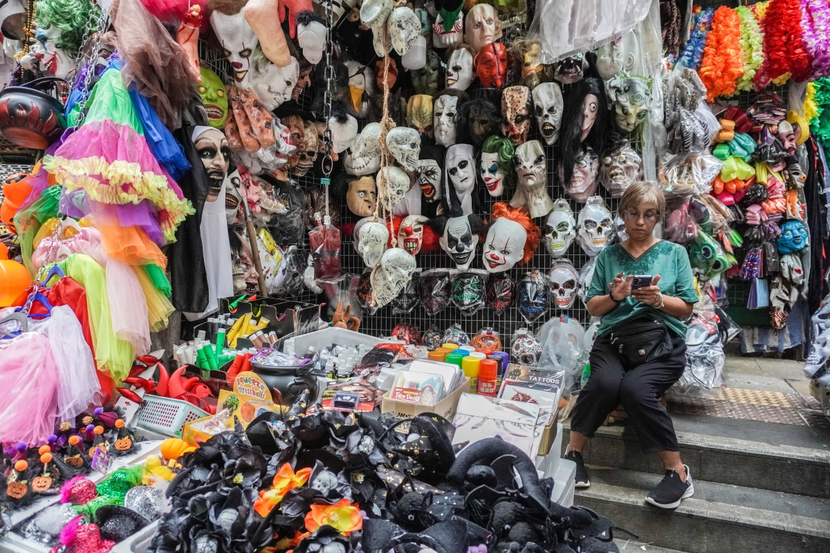 途人在拍攝琳瑯滿目的萬聖節裝飾用具