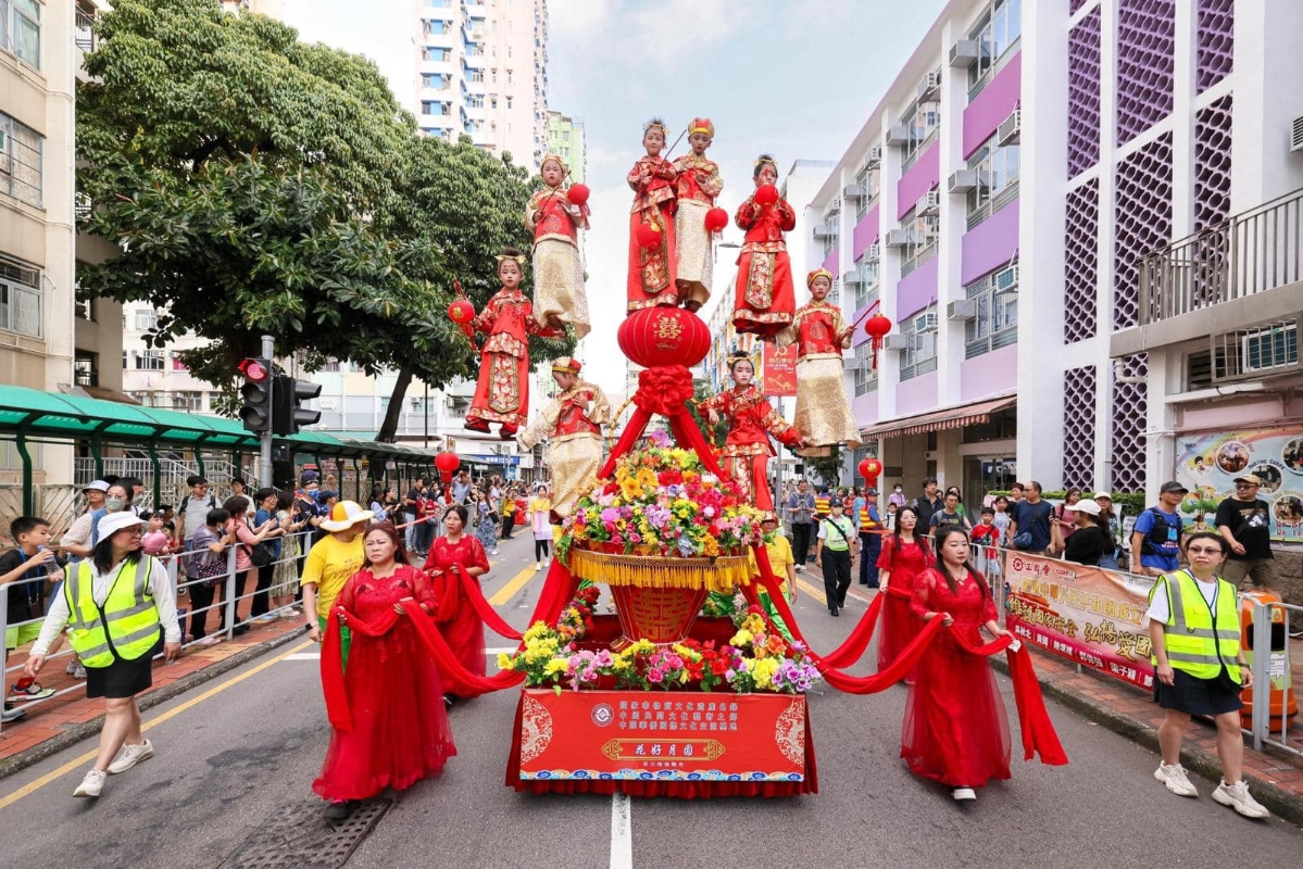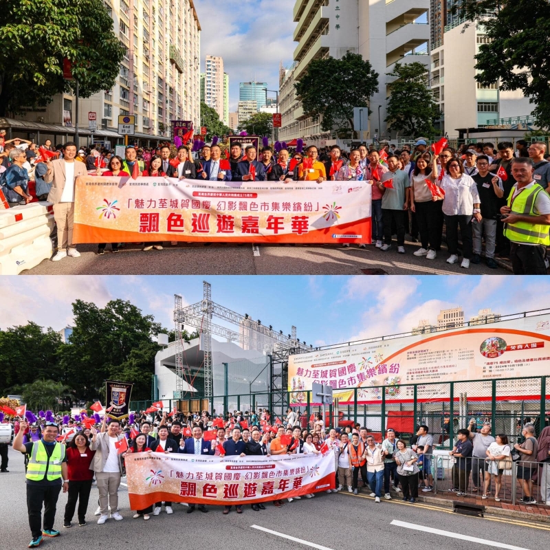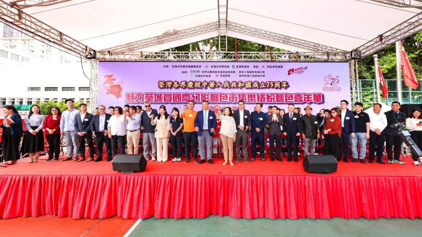 圖源:荃灣各界慶祝國慶籌委會fb 與此同時,10月20日荃灣街頭熱鬧非凡。作為本次活動的重頭戲“飄色巡遊嘉年華”,吸引了大批市民前來欣賞精彩的飄色表演。今次的巡遊嘉年華特別邀請遠道而來的“吳川梅嶺飄色藝術團”,該藝術團來自湛江吳川市梅菉街道梅嶺社區,為“國家非物質文化遺產名錄(飄色)”的傳承基地。梅嶺飄色藝術團是湛江市最活躍的民間藝術表演團隊,代表著吳川市“中國民間文化藝術之鄉”的文化品牌,承載著豐富傳統文化,為當地人民提供獨特的文化資源及遺產。 “飄色巡遊嘉年華”,由荃灣各界慶祝國慶籌委會執行主席陳曉津區議員等籌委會成員,陪同民政及青年事務局麥美娟局長、中聯辦新界工作部盧金榜處長、全國人大代表陳勇立法會議員、荃灣民政事務專員暨荃灣區議會主席區家盛太平紳士參與主禮並參觀場內攤位。立法會議員陳恒鑌先生、陳穎欣女士、郭玲麗女士及一眾荃灣政府部門代表、荃灣民政處各委員會成員、關愛隊成員及地區領袖等均撥冗出席活動。