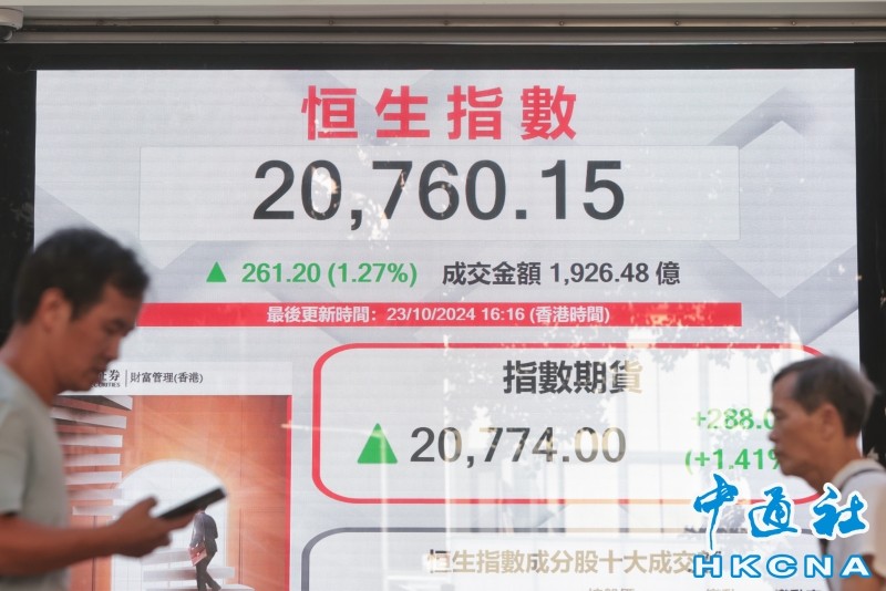 香港中通社10月23日電 (記者 譚暢)港股23日收市報20760點,升261點或1.3%。大市全日成交金額約為1926.5億港元。