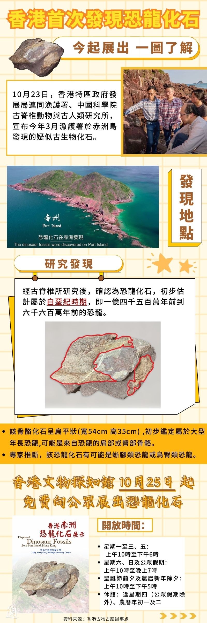 香港新聞網10月25日電 10月23日,香港特區政府發展局連同漁護署、中國科學院古脊椎動物與古人類研究所宣布今年3月漁護署於赤洲島發現的疑似古生物化石。 經古脊椎所研究後,確認為恐龍化石,初步估計屬於白堊紀時期,即一億四千五百萬年前到六千六百萬年前的恐龍。據悉,骨骼化石呈扁平狀(寬54cm,高35cm),初步鑑定屬於大型年長恐龍,可能是來自恐龍的肩部或臀部骨骼。專家推斷,該恐龍化石有可能是蜥腳類恐龍或鳥臀類恐龍。