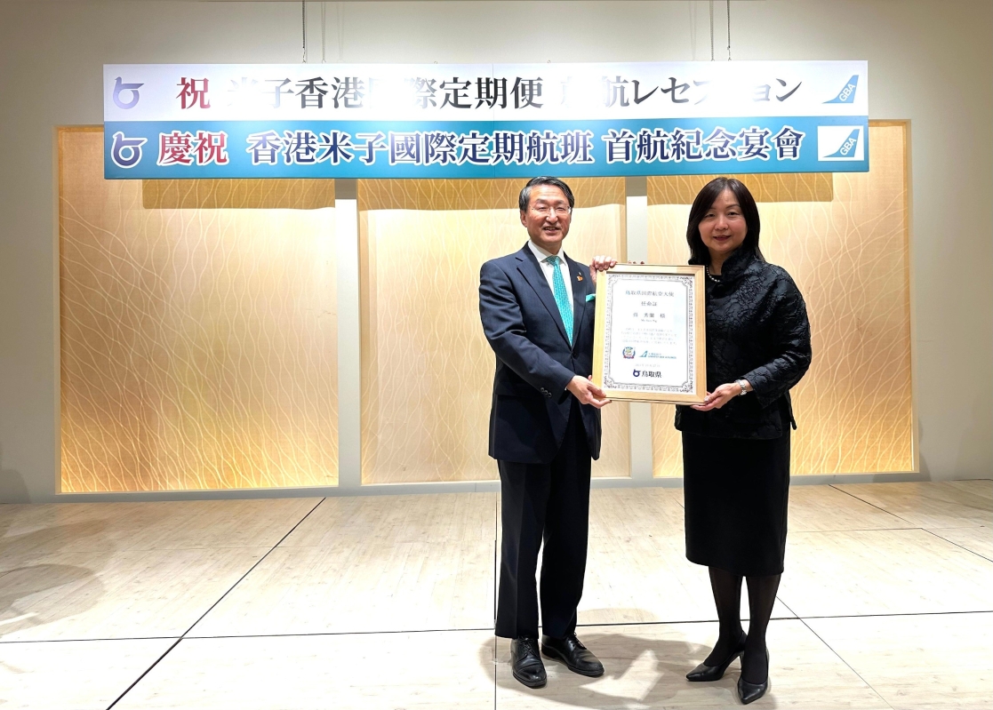 鳥取縣知事平井伸治於歡迎儀式上,正式委任吳秀蘭為“鳥取縣國際航空大使”。(大灣區航空供圖)