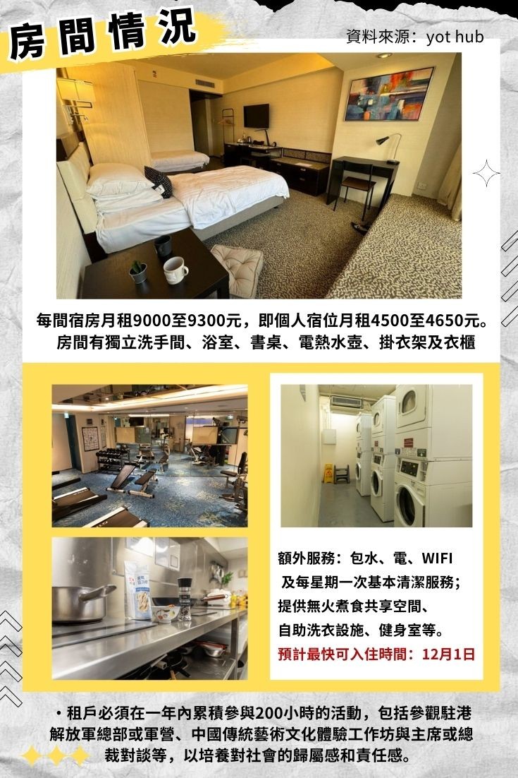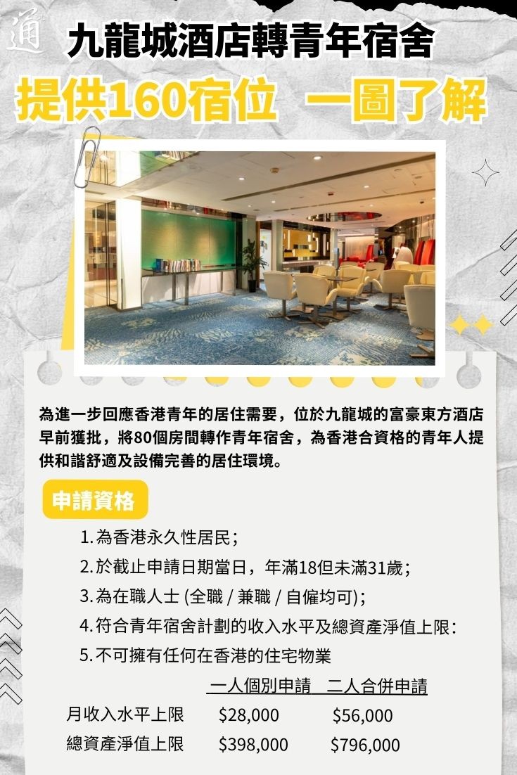 香港新聞網10月29日電 位於香港九龍城的富豪東方酒店早前獲政府批准,將80個房間轉作青年宿舍,為香港合資格的青年人提供和諧舒適及設備完善的居住環境。 青年宿舍名為“YOT Hub仁愛龍城青年宿舍”,位於九龍城沙浦道,共有80個房間,可提供最多160個宿位,每月宿費4,500至4,650港元,包水電及上網費。該項目不僅為合資格的在職青年提供獨立生活空間,同時會為青年租戶提供培訓課程、交流活動及實習計劃,加強青年對國家發展機遇的了解,並且會提供不同類型的自我增值和支援服務,協助青年實現個人發展目標。