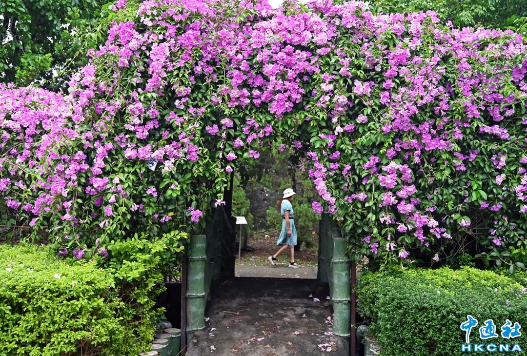 台灣新北市泰山區楓樹河濱公園,紫色蒜香藤花已經盛開,一整條長達200多公尺的花道,紫紅色的蒜香藤花順著棚架攀延而下,形成花瀑布,吸引大批遊客前來。香港中通社圖片