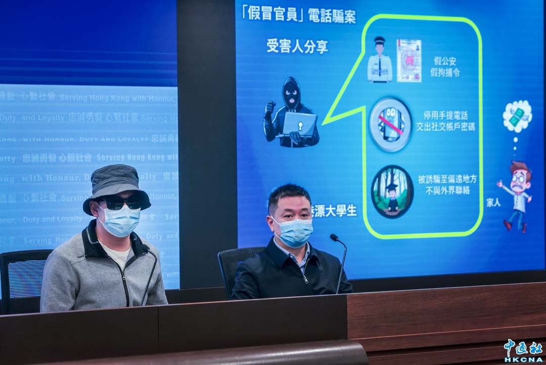由9月開學至今2個月,香港警方接獲55宗內地港漂生誤墮“假冒官員”騙案,涉及騙款高達3900萬港元。其中一宗案件,18歲大一学生阿聰(化名)10月初收到來自騙徒的視像通話,當時對方身穿像真度高的內地公安制服,向他展示一份起訴書及拘捕令,令他深信自己被通緝。為洗脫罪名,他跟從騙徒一切指示,自行拍攝假扮被禁錮的相片,交出其微信及其他通訊軟件的帳戶和密碼,到偏遠郊區匿藏。最終騙徒透過阿聰的微信向其父親索取600萬港元,幸父親及時識破報警求助,未有造成任何損失。圖為事主阿聰(左)及父親(右)11月9日出席記者會講述案件經過。(香港中通社記者 謝光磊攝)