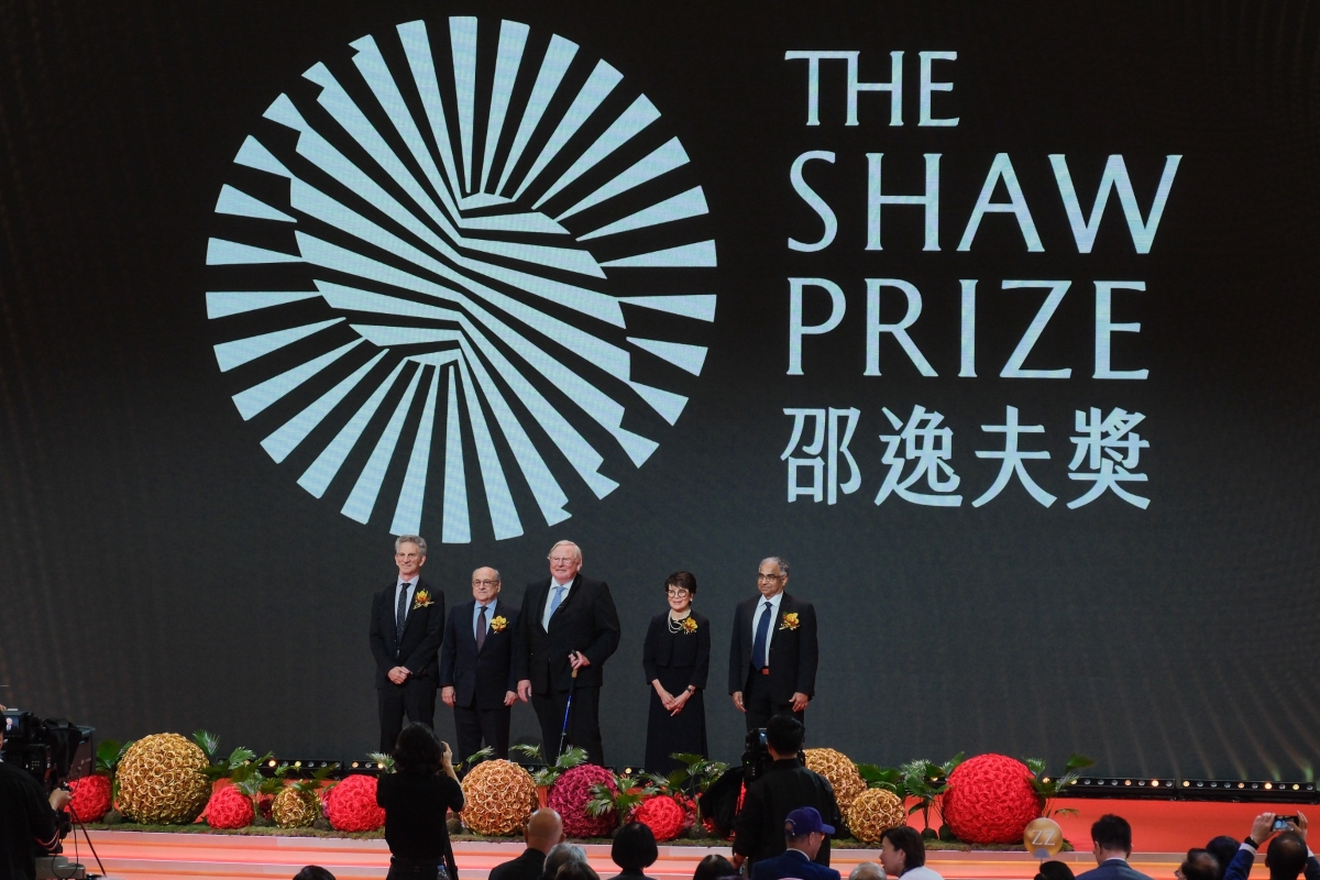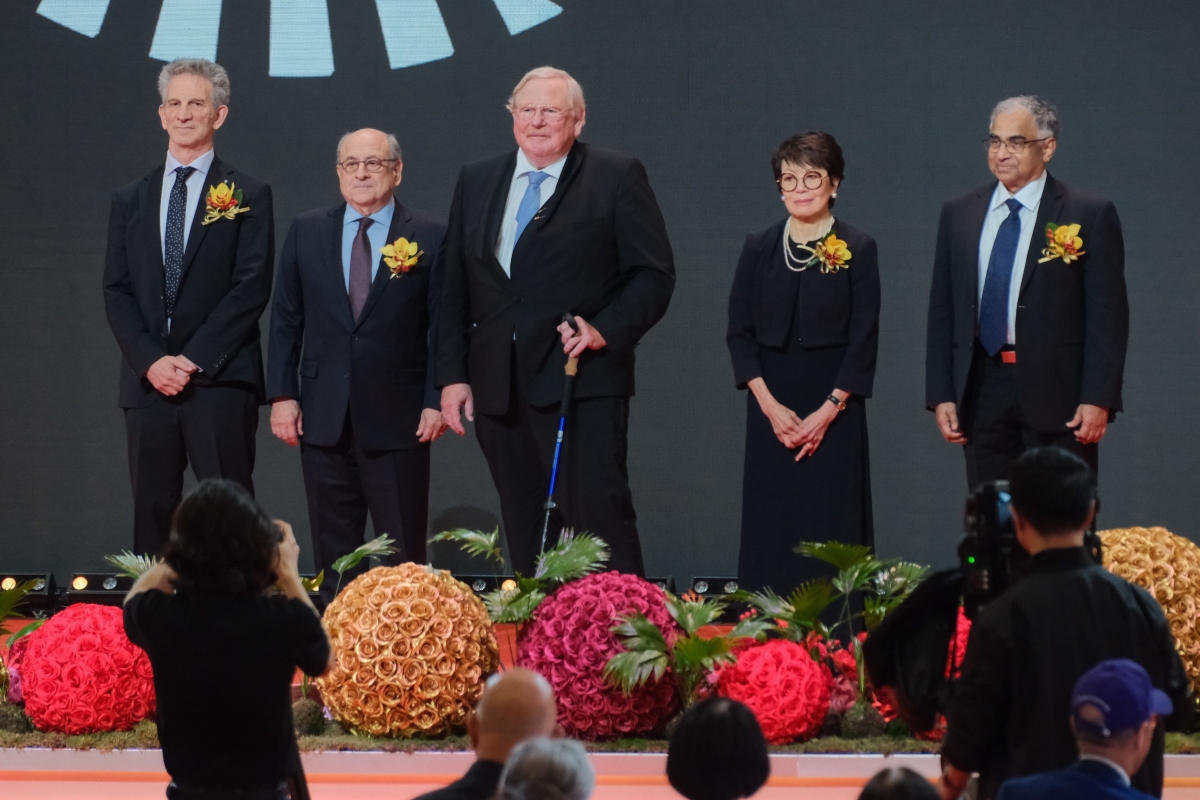 今年一共有五名科學家來港接受獎項,包括四位2024年度邵逸夫獎得獎者以及一位2021年度得獎者。2024年度得獎者,包括天文學獎得獎主史里尼瓦斯・庫爾卡尼(右一)、生命科學與醫學獎得獎主鄧瑞麗(右二)和斯圖爾特・奧金(左二),以及數學科學獎得獎主彼得・薩納克(左一),由邵逸夫獎評審會主席萊因哈德·根舍(中)頒獎