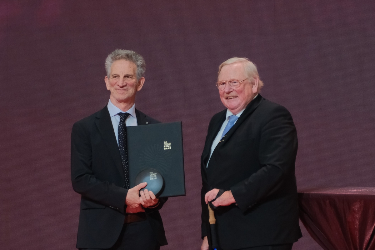 2024年度生命科學與醫學獎得獎主斯圖爾特・奧金(左)接受頒獎
