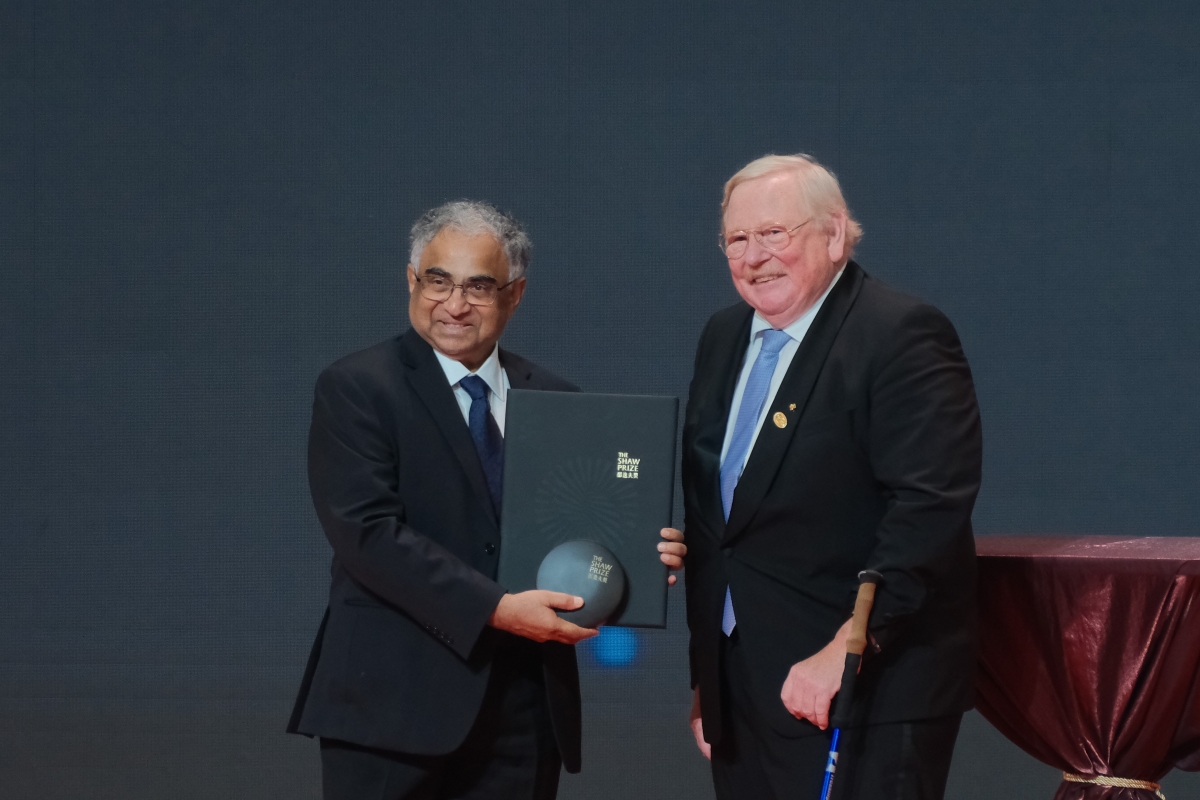 2024年度天文學獎得獎主史里尼瓦斯・庫爾卡尼(左)接受頒獎