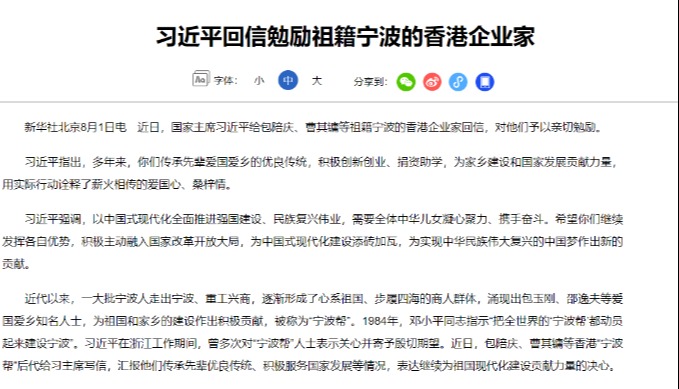 寧波幫博物館。香港中通社圖片 著名電影製作人、慈善家邵逸夫,華人世界船王包玉剛,香港“毛紡大王”曹光彪……“寧波幫”湧現出無數祖籍寧波的香港知名政商界人士,他們都為建設中國做出極大貢獻,其足跡更遍布香港乃至全球各地,促進浙港情誼愈發深厚。 早前,習主席曾回信給祖籍寧波的香港企業家,肯定他們傳承先輩愛國愛鄉的優良傳統,積極創新創業、捐資助學。在寧波幫博物館,這封回信,全文投影在一個巨型屏幕上。 寧波幫博物館建築面積近2.4萬平方米,2009年建成開館。據工作人員介紹,博物館的主建築群為“甬”字型結構,由綜合展區、專題展區和臨時展覽三部分組成;館內藏品5000餘件,絕大多數通過海外征集聯絡無償取得,涉及各個歷史時期寧波幫人士、家族、優勢發展領域、重點發展區域、代表社團組織等相關史料、實物。 寧波與香港的聯繫,究竟有多深?據最新調查統計,當前共有67.7萬寧波籍港澳台海外人士、16個港澳台寧波同鄉社團。 數據僅是這種聯結的一個抽象概括,館內的一件件展品則似乎在生動訴說。有展區講述祖籍寧波的香港企業家的故事,例如在港創辦通利琴行、被稱為“香港樂器之王”的李孫文英,一架外形樸拙的棕色木製鋼琴在玻璃展櫃內,琴架上的磨損悄聲講述著時間的流逝。 港龍航空捐贈的三小架飛機模型,以“一飛沖天”的樣式,陳列在展台。機身是經典的白色,窗戶的位置及機翼則是溫暖的橙紅,讓人不由思索,首個以華人身份在港創辦港龍航空公司的曹光彪,究竟是怎樣才突破了港英當局的重重阻撓,向天空尋找商機。 是次採風圖成員中,香港新聞聯副主席、海灣媒體資本投資高級顧問頋堯坤的母親便是寧波人。在探訪寧波幫博物館時,他的感觸亦格外深刻。頋堯昆指,在母親逝世前,每年都會回到寧波陪她小住;自己小時總在母親口中聽到有關寧波的故事,如今探訪寧波幫博物館,愈發感受到寧波幫的過人之處,及其為港發展的巨大貢獻。 寧波幫博物館的成就專題展區中,最後一個展區名為“薪火永傳”。相信浙港兩地的情誼,同樣也能如薪火一般代代相傳。(完) 【編輯:淩玉輝】