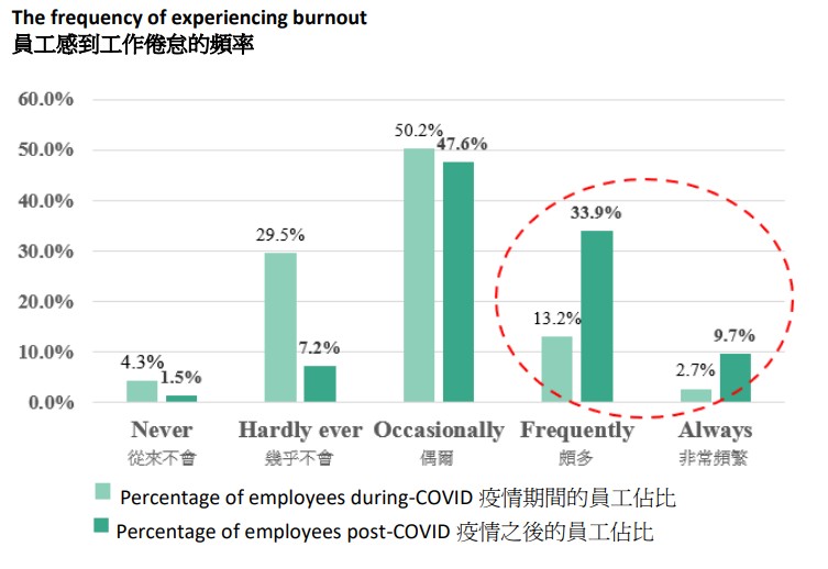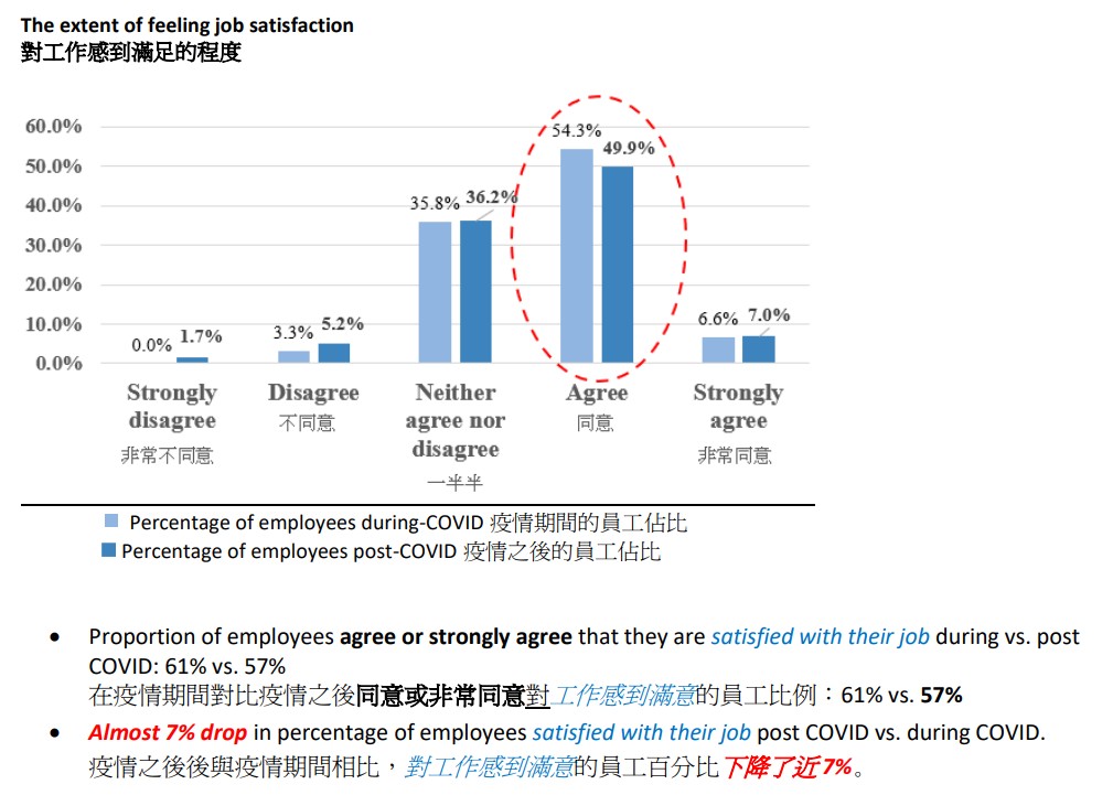 (數據來源:港大經管學院行為與決策科學研究所與香港優質顧客服務協會) 調查發現,疫後員工出現工作倦怠的比率較疫情前增加了1.7倍。研究團隊建議企業應推行創新措施以支援員工的心理健康,這不僅能減輕其壓力,還能提升顧客體驗並增強公司的競爭力。 研究數據顯示,在疫情期間,61%的員工同意或非常同意對工作感到滿意,但這一比例在疫情之後下降至57%,顯示出近7%的下降。此外,在疫情期間,約15.9%的員工經常或一直感到工作倦怠,而在疫情之後,這一比例大幅上升至43.6%。員工經常感到工作倦怠的主要原因是阻礙性壓力源,如硬性的約束與限制、分工模糊、顧客與公司間的需求衝突等,而非工作量的增加。這些壓力不但影響了員工的心理健康,還妨礙了他們提供高質素服務的能力。