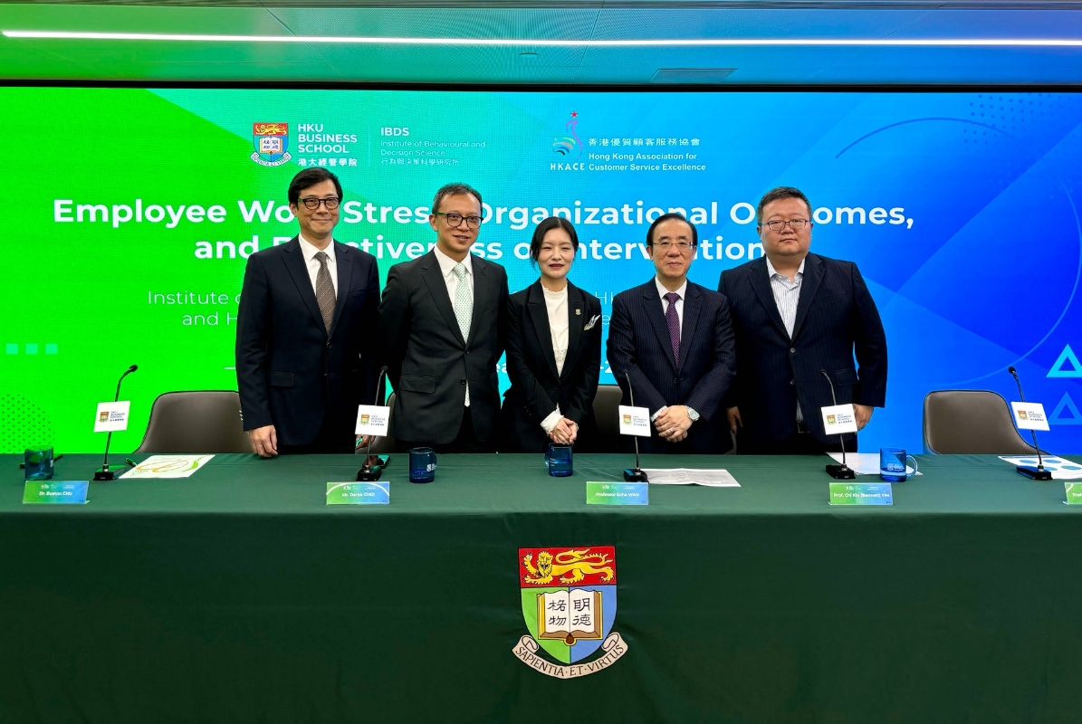 港大經管學院行為與決策科學研究所與香港優質顧客服務協會展開一項合作研究,今日(26日)發佈研究結果。(香港中通社記者 黃璇攝) 此項研究在疫情期間及其後進行,收集了近1000份來自私營及公營機構員工的問卷,並進行超過40次的焦點小組及深入訪談,分析了員工壓力的來源及公司支援措施的實際成效。