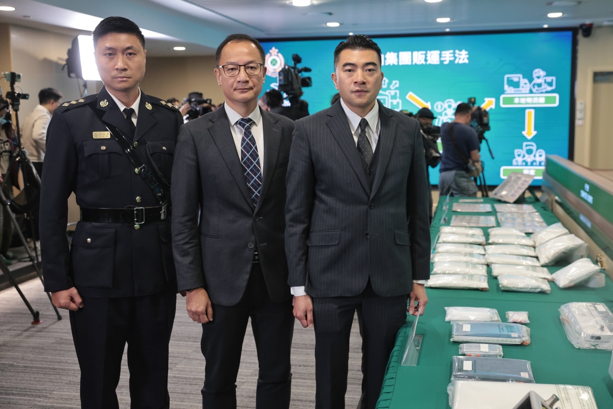署理海關助理關長(情報及調查)黃浩然(中)、海關毒品調查科毒品調查第三組指揮官劉偉倫(右)和海關機場科空運貨物第三組指揮官何天康(左)出席記者會。