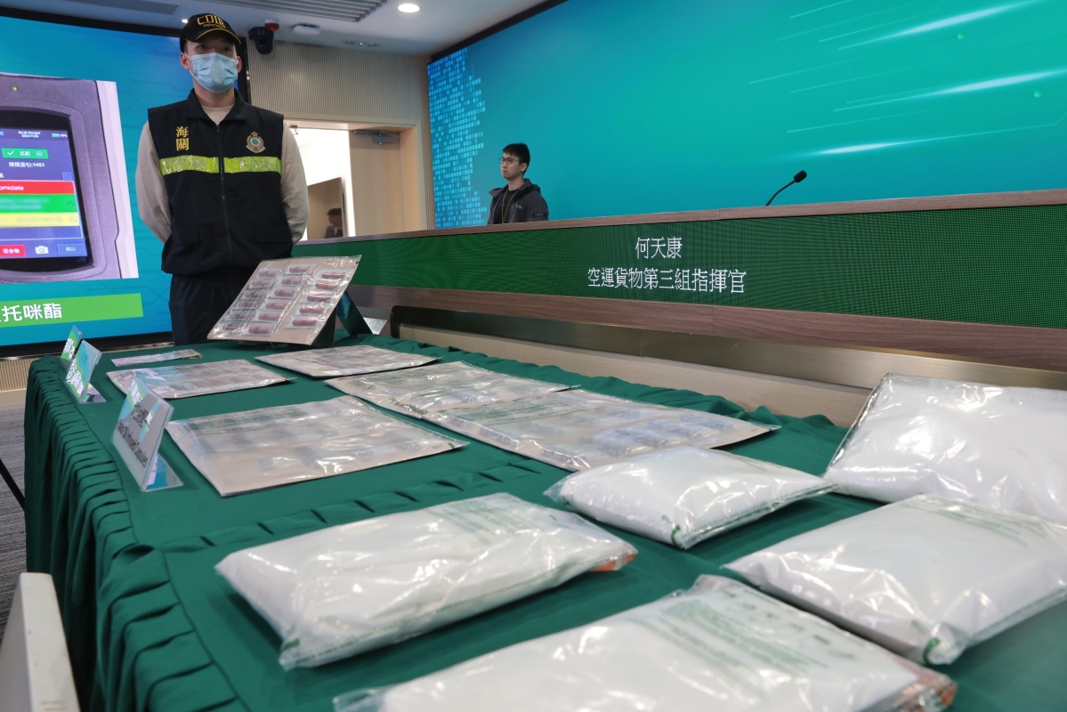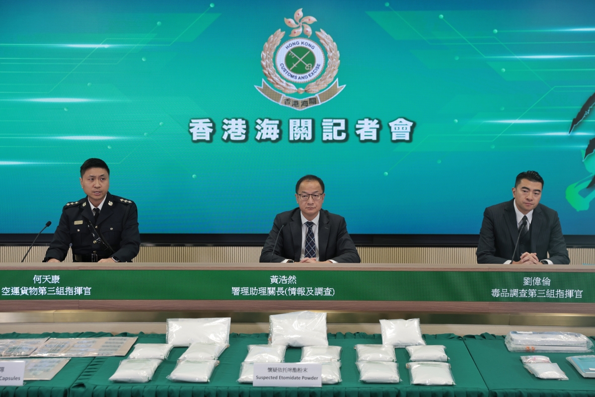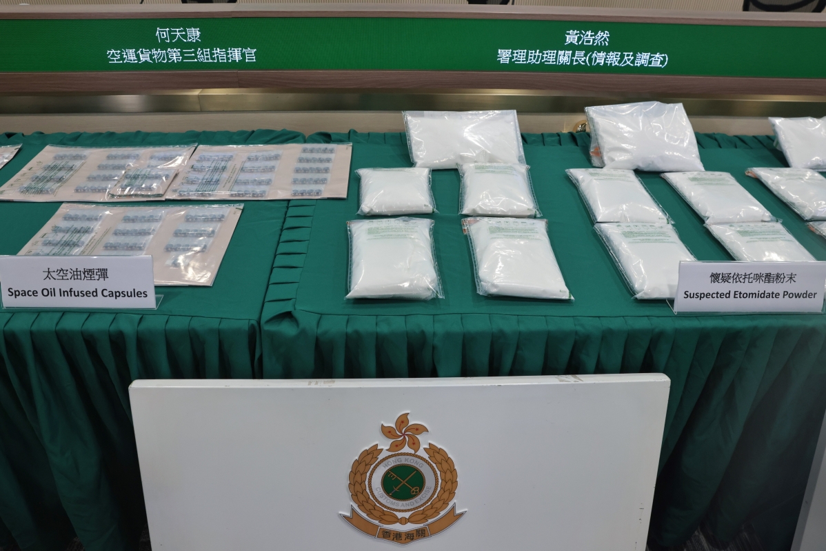 香港新聞網11月27日電(記者 謝光磊 )11月27日,香港海關舉行記者會,講述於11月展開的連串反“太空油”行動。行動破獲9宗管有屬《藥劑業及毒藥規例》下第1部毒藥的依托咪酯(“太空油”的主要成分)案件,共檢獲191粒太空油煙彈及16公斤可製成約48000粒太空油煙彈的依托咪酯粉末,市值共約1700萬港元,並拘捕七名懷疑涉案人士,被捕人包括一名小學教師。署理海關助理關長(情報及調查)黃浩然、海關毒品調查科毒品調查第三組指揮官劉偉倫和海關機場科空運貨物第三組指揮官何天康出席記者會。