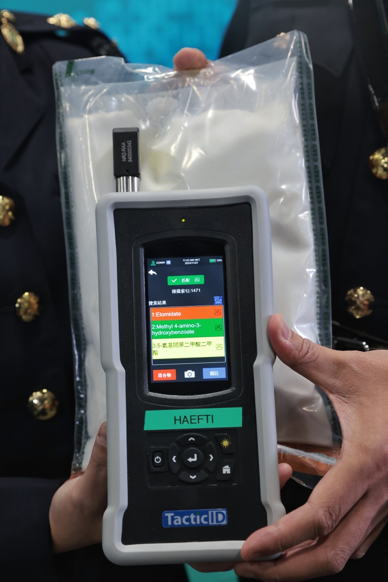 海關展示利用拉曼光譜分析儀,檢測白色粉末就是依托咪酯